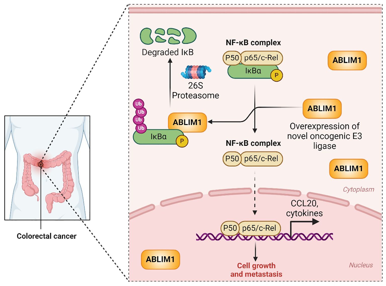Figure 1. ABLIM1 functions as a novel E3 ubiquitin ligase to drive CRC growth and metastasis via ubiquitination-mediated degradation of IĸBα and activation of NF-ĸB-CCL20 oncogenic signaling. The cartoon on the left shows a patient suffering from CRC. A colorectal cancer cell is zoomed in the right to depict ABLIM1 overexpression and the underlying molecular mechanisms that drive growth and metastasis in CRC. IĸBα sequesters the NF-ĸB complex (P50-P65/c-Rel) in the cytoplasm and thereby inactivates the NF-ĸB signaling. Overexpressed ABLIM1 interacts with and polyubiquitinates IĸBα, leading to its degradation by the 26S proteasome. Thus, the freed NF-ĸB complex enters into the nucleus and transcriptionally activates the expression of CCL20 and other cytokines which ultimately leads to CRC growth and metastasis.