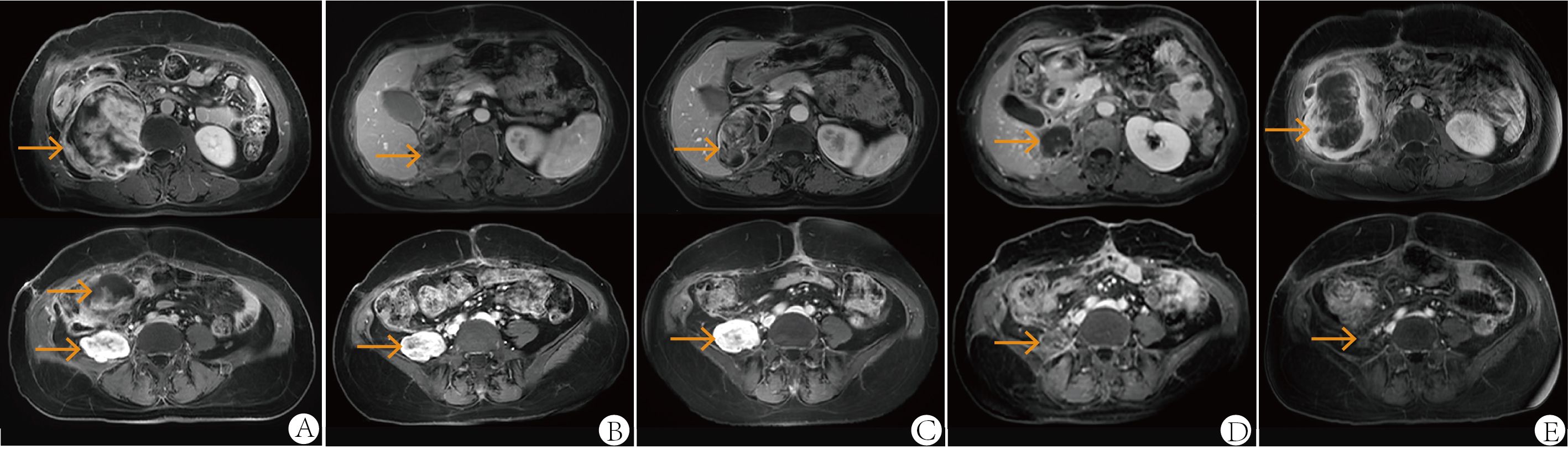 Figure 2. Abdominal MRI at first relapse in October 2021 (A), one month after the second surgery in April 2022 (B), after two cycles of second-line therapy (gemcitabine plus albumin paclitaxel) in June 2022 (C), after six cycles of third-line therapy (eribulin plus sintilimab, combined with radiotherapy) in December 2022 (D) and at follow-up in June 2023 (E). All images were acquired with T1-weighted sequences.