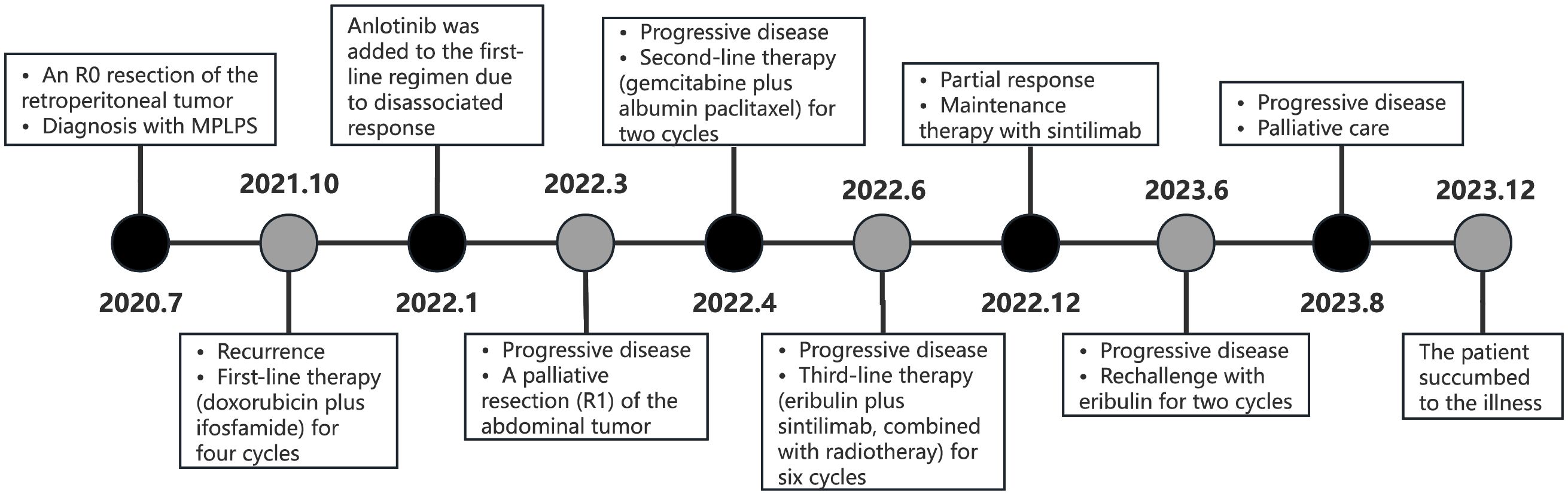 Following the patient’s decision to pursue surgical intervention for the abdominal tumor, palliative cytoreductive surgery was performed. Intraoperatively, the tumor was found to be large and densely adherent to surrounding structures, necessitating extensive en bloc resection including the right kidney and right adrenal gland, partial repair of the abdominal aorta and inferior vena cava, limited repair of the colon and adhesiolysis. Final pathological evaluation confirmed an R1 resection margin. However, the MRI showed a rapid increase in tumor volume only one month after surgery (Figure 2B). The patient’s recovery from the second procedure was sufficient to permit the initiation of subsequent systemic therapy. In April 2022, the patient started second-line therapy of gemcitabine plus albumin paclitaxel. Unfortunately, the outcome was evaluated as PD after two cycles (Figure 2C). After a multi-disciplinary discussion, the patient was started on combination therapy of eribulin (2mg on days 1 and 8, every 3 weeks) and PD-1 inhibitor sintilimab (200mg, every 3 weeks) in June 2022. Concurrently, she underwent low-dose radiotherapy targeting the abdominal tumor. The radiation dose was escalated in coordination with immunotherapy and eribulin. A total dose of 54 Gy was delivered to the gross tumor volume in 18 fractions, covering the region from the upper border of the 11th thoracic vertebra to the lower border of the 5th lumbar vertebra (Figure 3). After six cycles of combination therapy, the tumor gradually decreased in size, achieving a partial response (PR) in December 2022 (Figure 2D). Treatment-related adverse events included fatigue, abdominal pain, leukopenia, neutropenia, thrombocytopenia as well as elevations in transaminases and uric acid, all graded as CTCAE Grade 1-2. Subsequently, the patient received maintenance therapy with sintilimab from December 2022, which effectively controlled all adverse events. Remission was sustained for 12 months. However, in June 2023, follow-up MRI indicated disease progression, accompanied by the gradual onset of abdominal pain (Figure 2E). Despite a rechallenge with eribulin, the disease progressed rapidly, and the patient declined further anti-tumor treatment. Regrettably, the patient succumbed to the disease in December 2023. Figure 4 illustrates the patient’s treatment course.