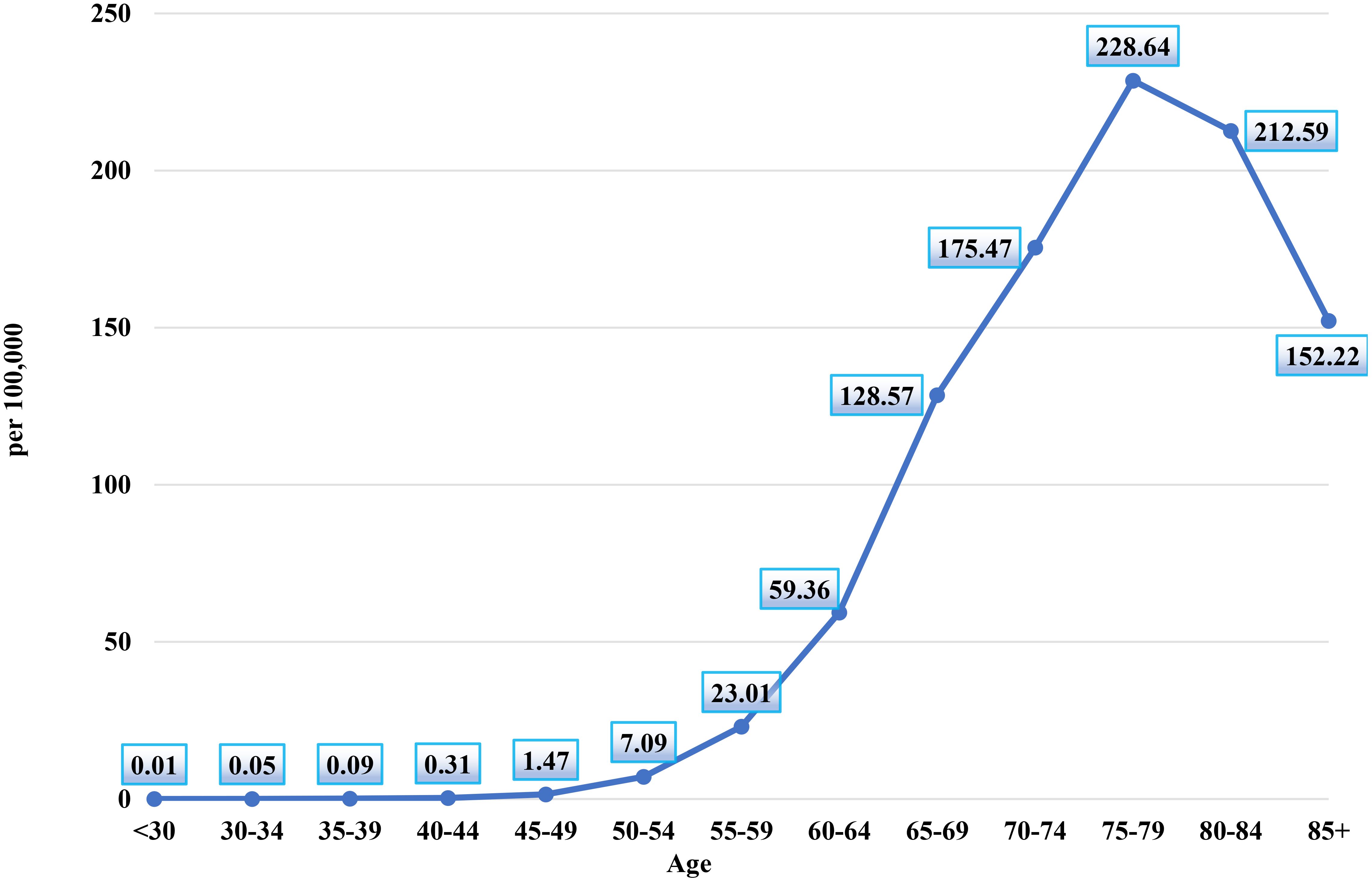 The rate of increase accelerates in the older age brackets. The incidence reaches 23.01 per 100,000 men in the 55–59 years group, and further climbs to 59.36 per 100,000 in the 60–64 years group. The sharpest increase occurs between the 65–69 years and 70–74 years groups, with the incidence rising from 128.57 per 100,000 to 175.47 per 100,000.