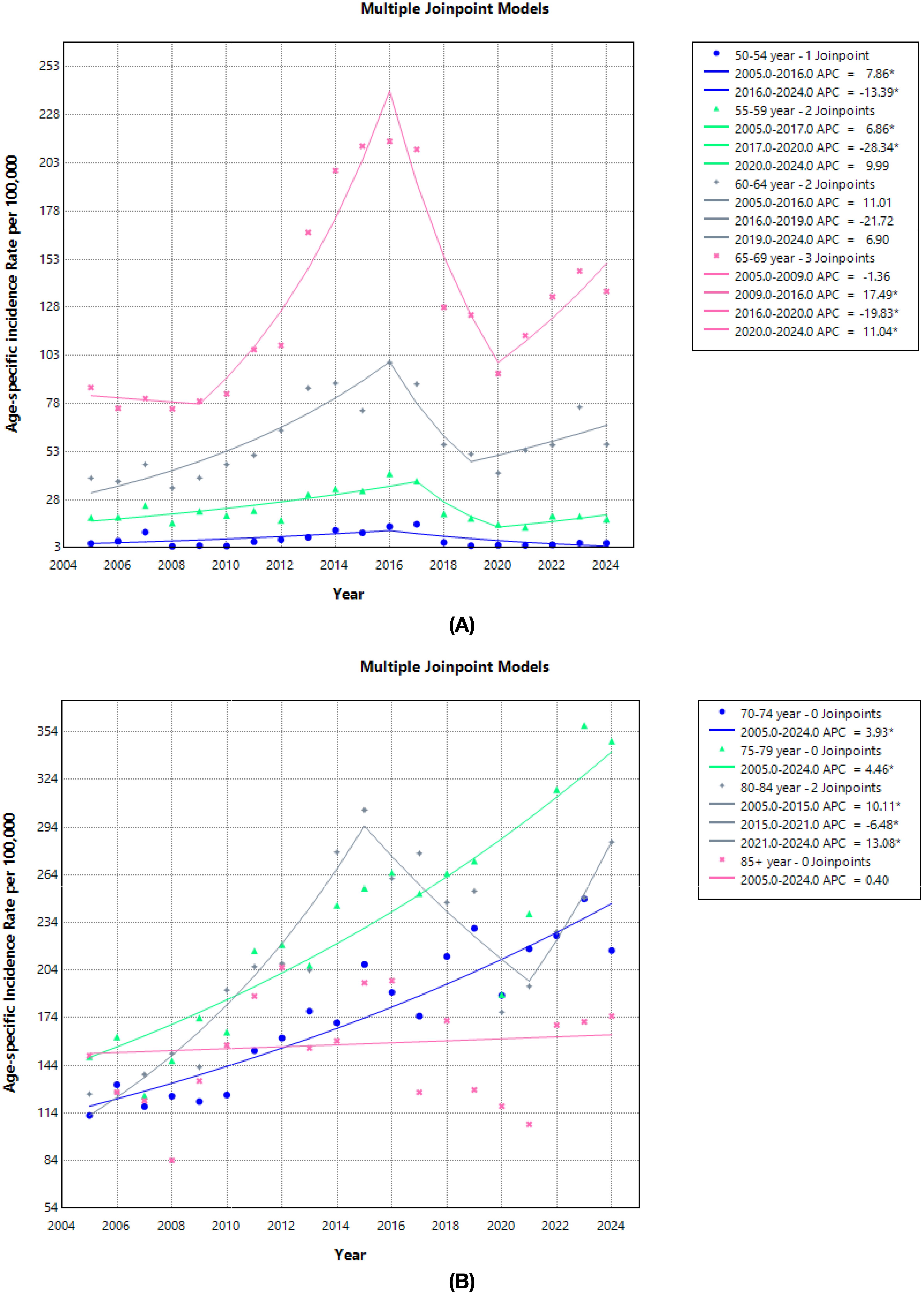 Figure 3. Trends in the age group specific incidence rate of prostate cancer cases for the period 2005-2024. (A) Trends in the age group (50-54, 55-59, 60-64, and 65-69) specific incidence rate of prostate cancer cases for the period 2005-2024. (B) Trends in the age group (70-74, 75-79, 80-44, and 85< year) specific incidence rate of prostate cancer cases for the period 2005-2024.