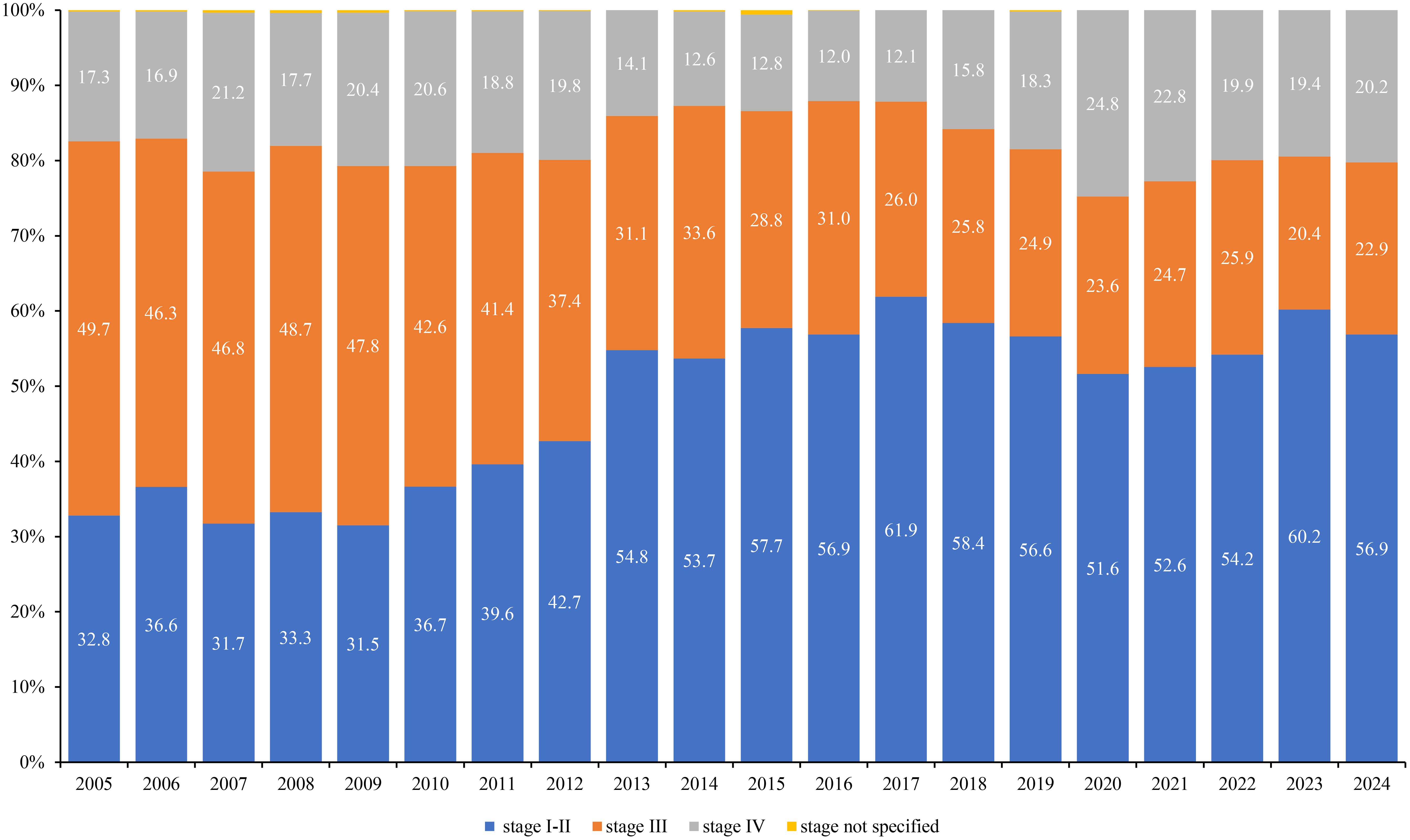 From 2005 to 2024, the stage distribution shifted toward earlier diagnosis. The proportion at stage I–II rose from 32.8% to 56.9% (+24.1 percentage points), while stage III declined from 49.7% to 22.9% (−26.8 points); stage IV changed little overall (17.3% → 20.2%, +2.9 points). The share of stage I–II first surpassed stage III in 2012 and remained higher thereafter. Cases with unspecified stage fell from 0.17% to 0%. Across the entire period, the mean proportions were 53.0% for stage I–II (95% CI 49.0-56.9), 29.3% for stage III (95% CI 25.8-32.9), and 17.6% for stage IV (95% CI 15.5-19.7). Linear trends indicate strong trends for stage I–II (R²=0.72) and stage III (R²=0.92), with no meaningful linear trend for stage IV (R²=0.02) (Figure 5).