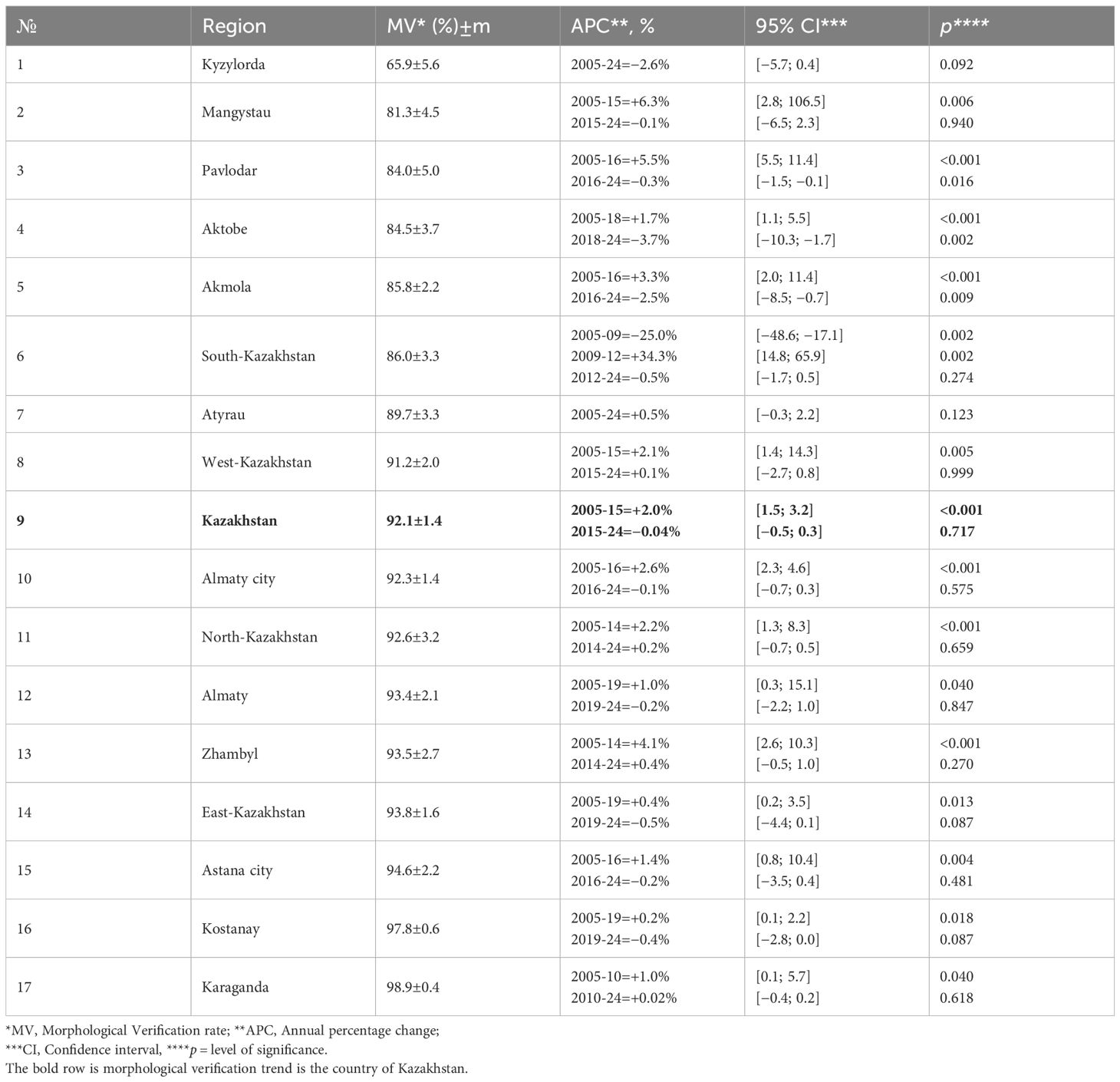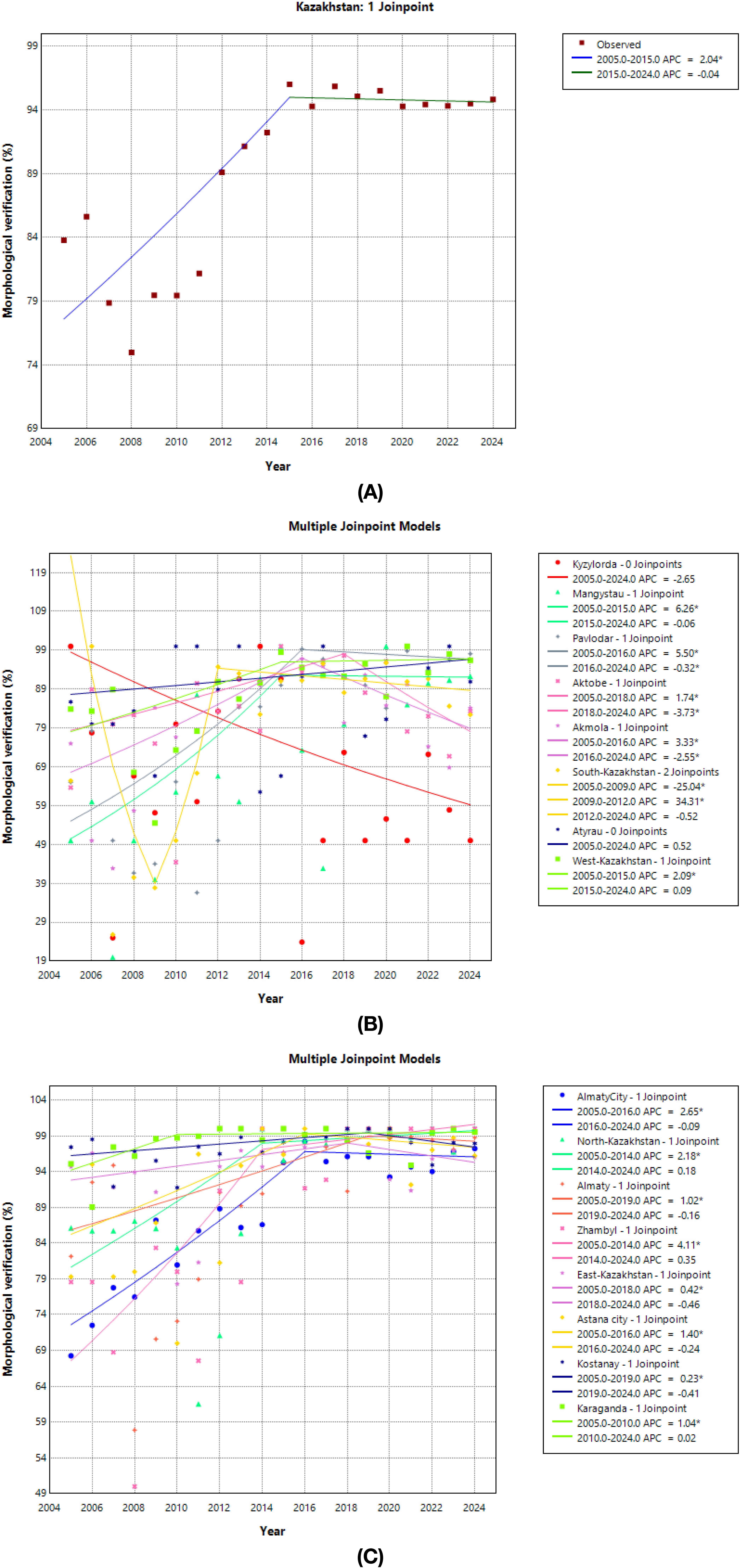 Figure 6. Trends of morphological verification rates by regions. (A) Trends of Morphological Verification Rates in Kazakhstan. (B) Trends of Morphological Verification Rates by Regions (Kyzylorda, Mangystau, Pavlodar, Aktobe, Akmola, South-Kazakhstan, Atyrau, and West-Kazakhstan). (C) Trends of Morphological Verification Rates by Regions (Almaty City, North-Kazakhstan, Almaty, Zhambyl, East-Kazakhstan, Astana City, Kostanay, and Karaganda).