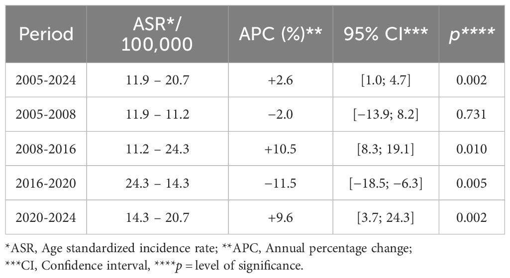 The ASR increased significantly from 11.9 in 2005 to 20.7 in 2024 with an APC of +2.6% (p = 0.002) (Table 2; Figure 1). Trends analysis has also described four periods: 2005–2008 APC of −2.0% (p = 0.731; not significant); 2008–2016 APC of +10.5% (p = 0.010); 2016–2020 APC of −11.5% (p = 0.005); and 2020–2024 APC of +9.6% (p = 0.002) (Table 2; Figure 1).