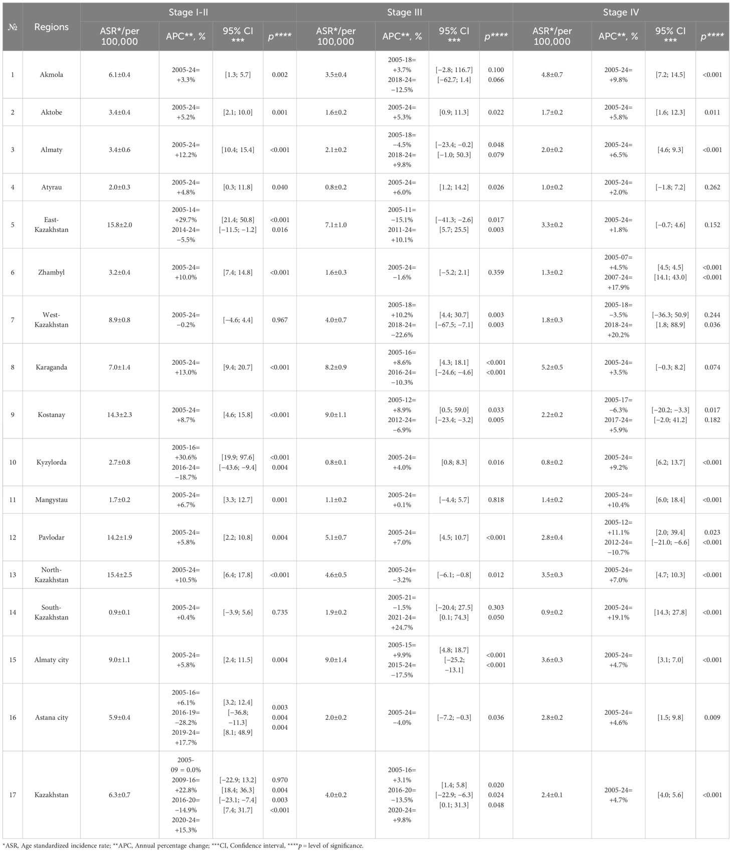 Nationally, the mean stage-specific incidence rates (per 100,000) were 6.3 ± 0.7 for stage I–II, 4.0 ± 0.2 for stage III, and 2.4 ± 0.1 for stage IV. Regionally, early-stage incidence was highest in East-Kazakhstan, North-Kazakhstan, Kostanay, and Pavlodar, and lowest in South-Kazakhstan, Mangystau, Atyrau and Kyzylorda; stage III was highest in Almaty city, Kostanay, Karaganda, and East-Kazakhstan and lowest in Atyrau, Kyzylorda, and Mangystau; stage IV was highest in Karaganda and Akmola and lowest in Kyzylorda, South-Kazakhstan and Atyrau (Table 5).
