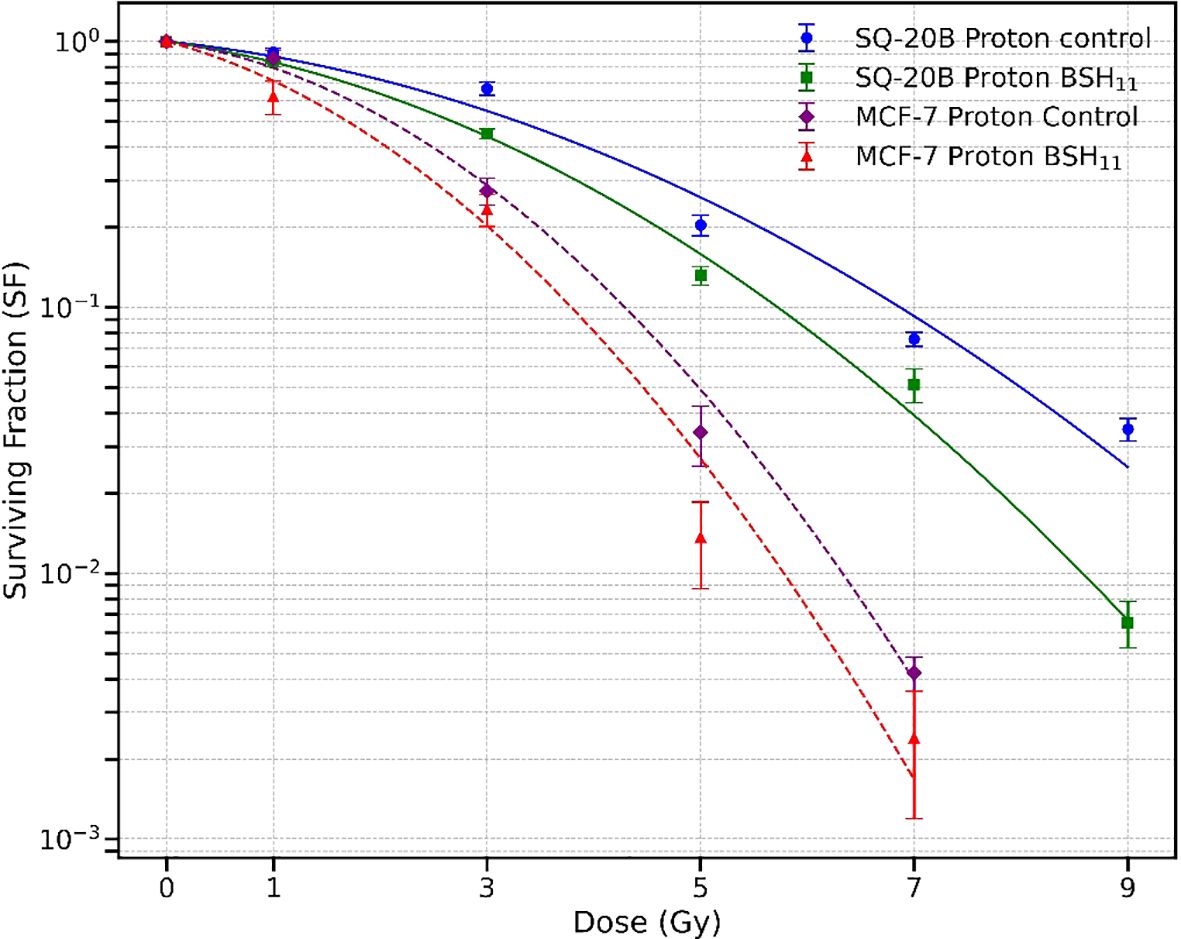 Figure 2. Survival curves for SQ-20B (solid lines) and MCF-7 (dashed lines) cell lines following proton irradiation, with and without 50 µM BSH11. For SQ-20B, circles represent control (no BSH11) and squares represent BSH11-treated cells; for MCF-7, diamonds represent control, and triangles represent BSH11-treated cells. Data points represent the mean ± standard error from three independent experiments. Curves were obtained from log-scale least-squares fit the experimental data.