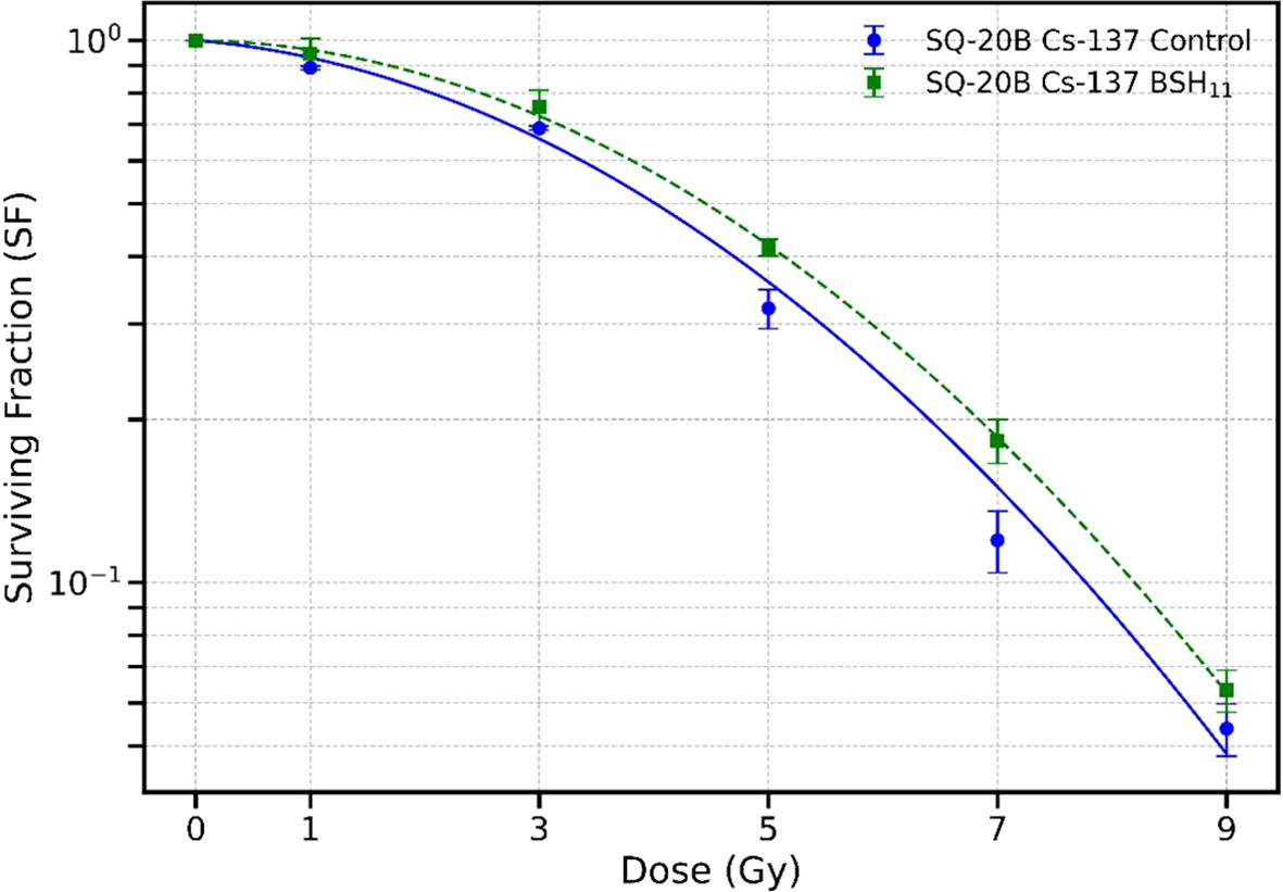 Figure 4. Survival curves for SQ-20B cells irradiated with Cs-137 gamma rays in the absence (circle) and presence (square) of 450 µM BSH11. Data points represent the mean ± standard error from three independent experiments. Data fitted with LQ model. No statistically significant difference in survival was observed between the two groups with D10 values of 7.78 ± 0.23 Gy (control) and 8.21 ± 0.25 Gy (BSH11) (p = 0.0920).