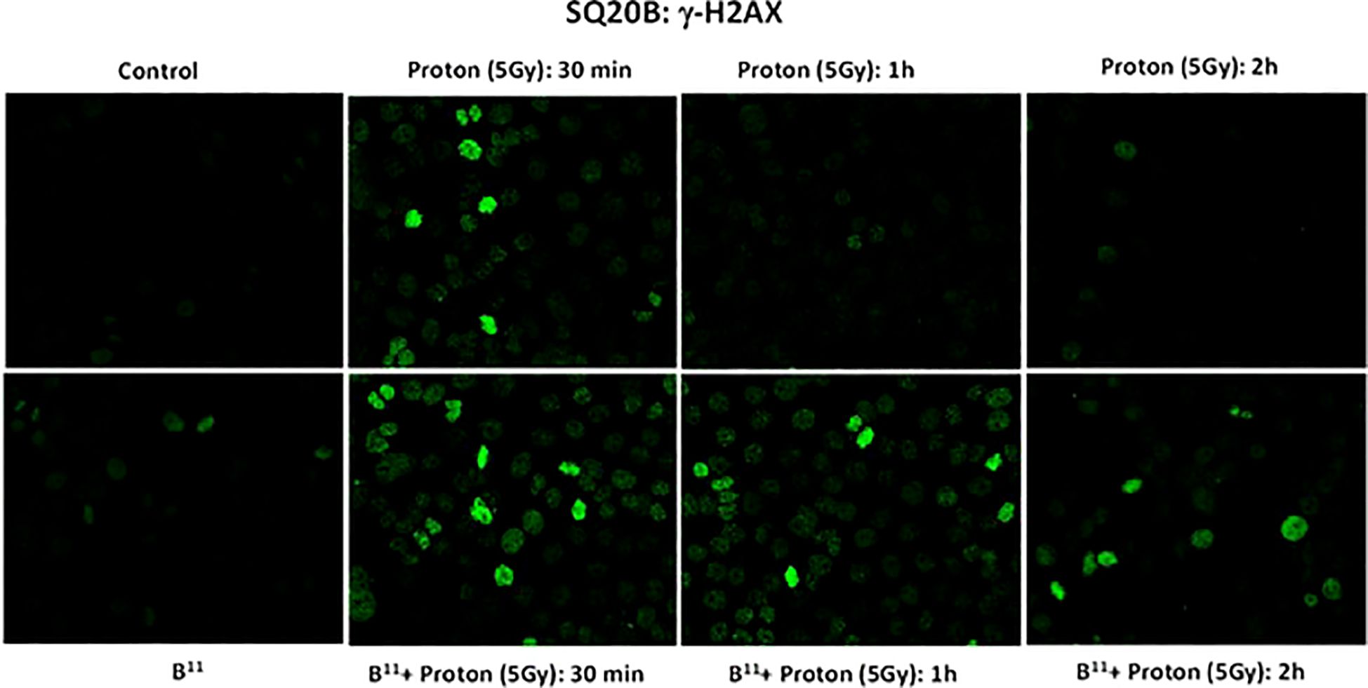Conclusions: Our data show a small enhancement of cell killing by proton radiation in the presence of BSH11 that we attribute to the proton-boron interaction. Analysis of γH2AX demonstrates a prolonged duration of foci formation in cells after proton irradiation in the presence of BSH11. Further research will be needed to better understand the potential clinical applications of proton-boron interaction.