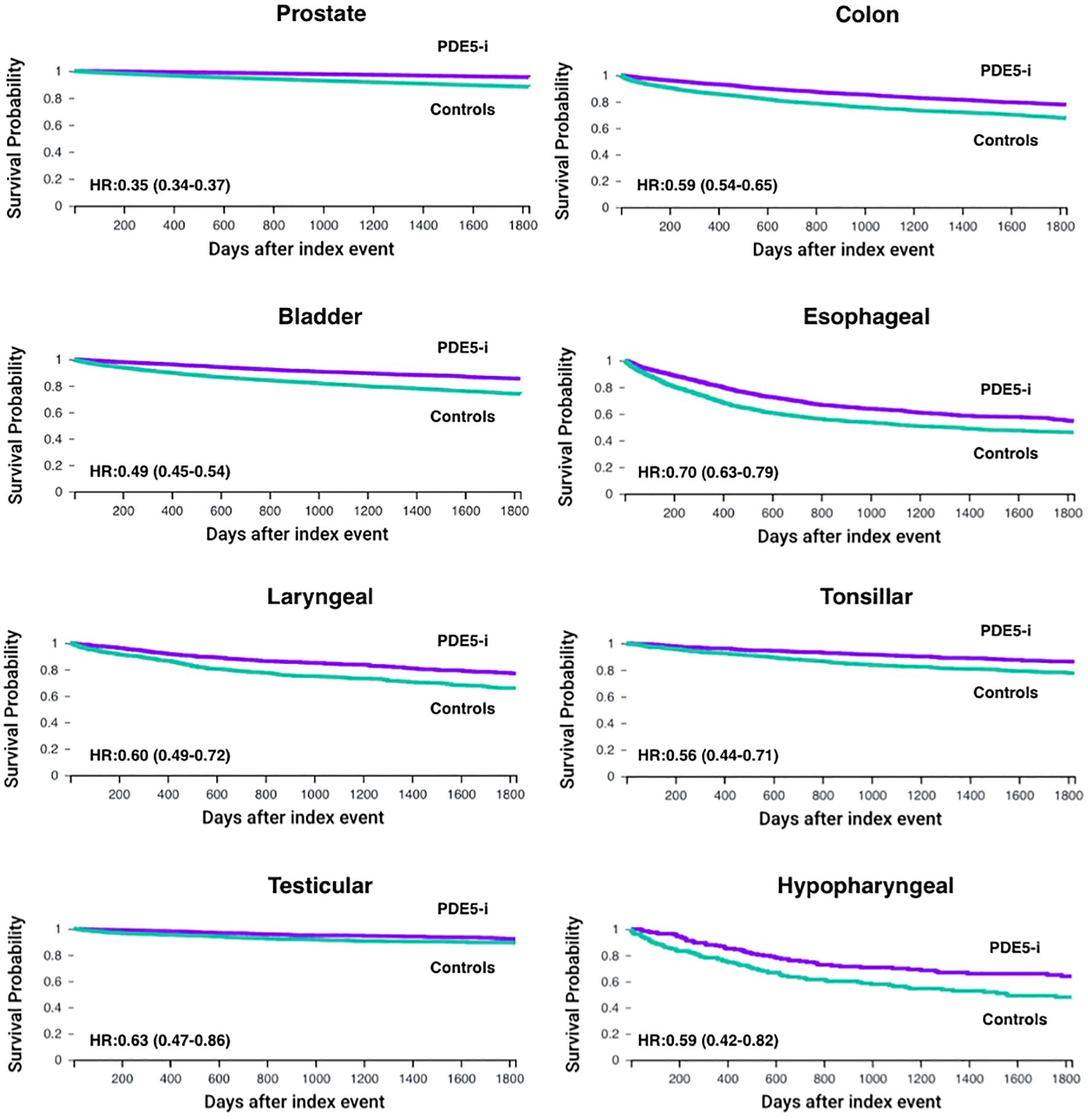 Figure 2. Kaplan–Meier curves for overall survival (OS) up to 5 years in male patients with male-predominant cancers, displaying individual cancer types. OS is shown for phosphodiesterase-5 inhibitor exposed (PDE5-i) group versus controls, after propensity score matching (PSM) for age, demographics and potential clinical confounders. Hazard ratios (HR) and 95% confidence intervals (CI) are provided for each cancer type.