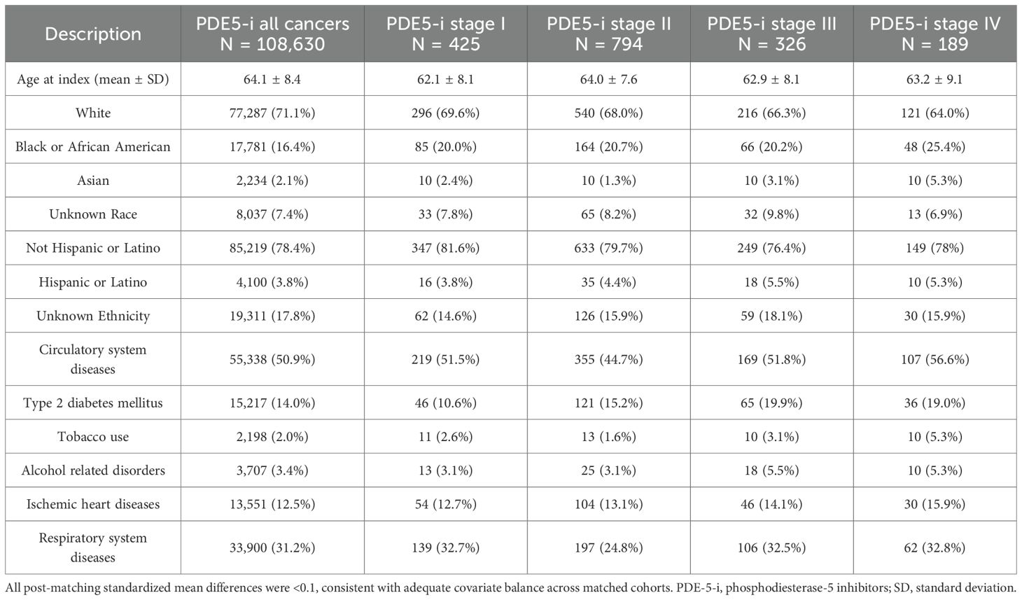 Table 1. Phosphodiesterase-5 inhibitors exposed cohort baseline characteristics for all cancers combined and stratified by overall stage, after propensity score matching (PSM).