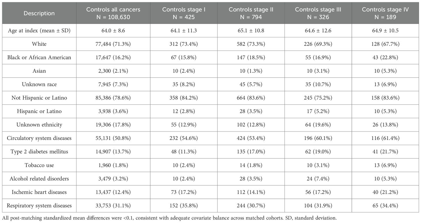 Table 2. Control cohort baseline characteristics for all cancers combined and stratified by overall stage, after propensity score matching (PSM).