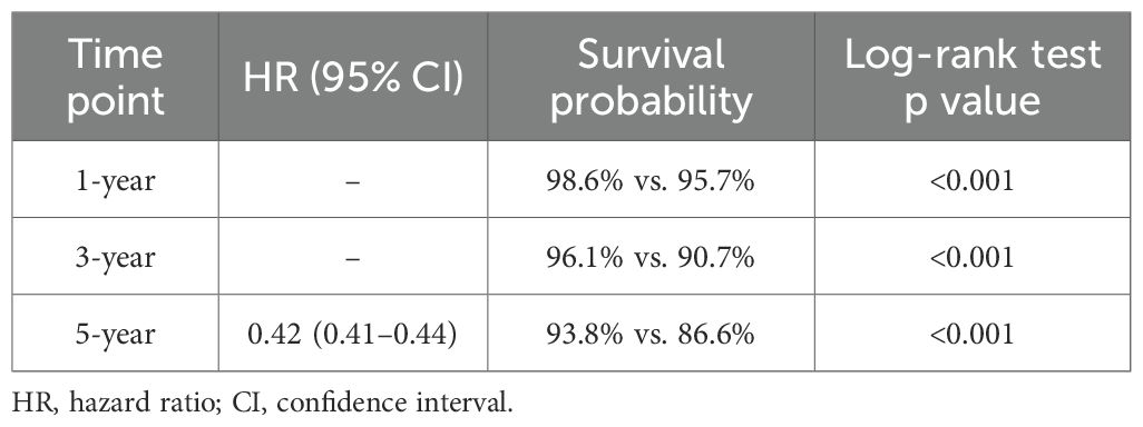 Results: After PSM, 108,630 patients were included in each arm of the pan-cancer analysis. PDE5 inhibitor exposure was associated with significantly improved OS at 1, 3, and 5 years compared with controls (5-year OS 93.8% vs 86.6%; HR, 0.42 [95% CI, 0.41–0.44]). Stratified analyses demonstrated significantly improved OS across all four stages, with hazard ratios ranging from 0.40 to 0.57. Subgroup analyses by tumor site likewise showed statistically significant improvement in OS for every included cancer type, with hazard ratios ranging from 0.35 to 0.70.