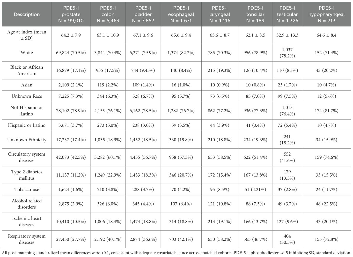 Table 4. Phosphodiesterase-5 inhibitors exposed cohort baseline characteristics for each cancer type, after propensity score matching (PSM).