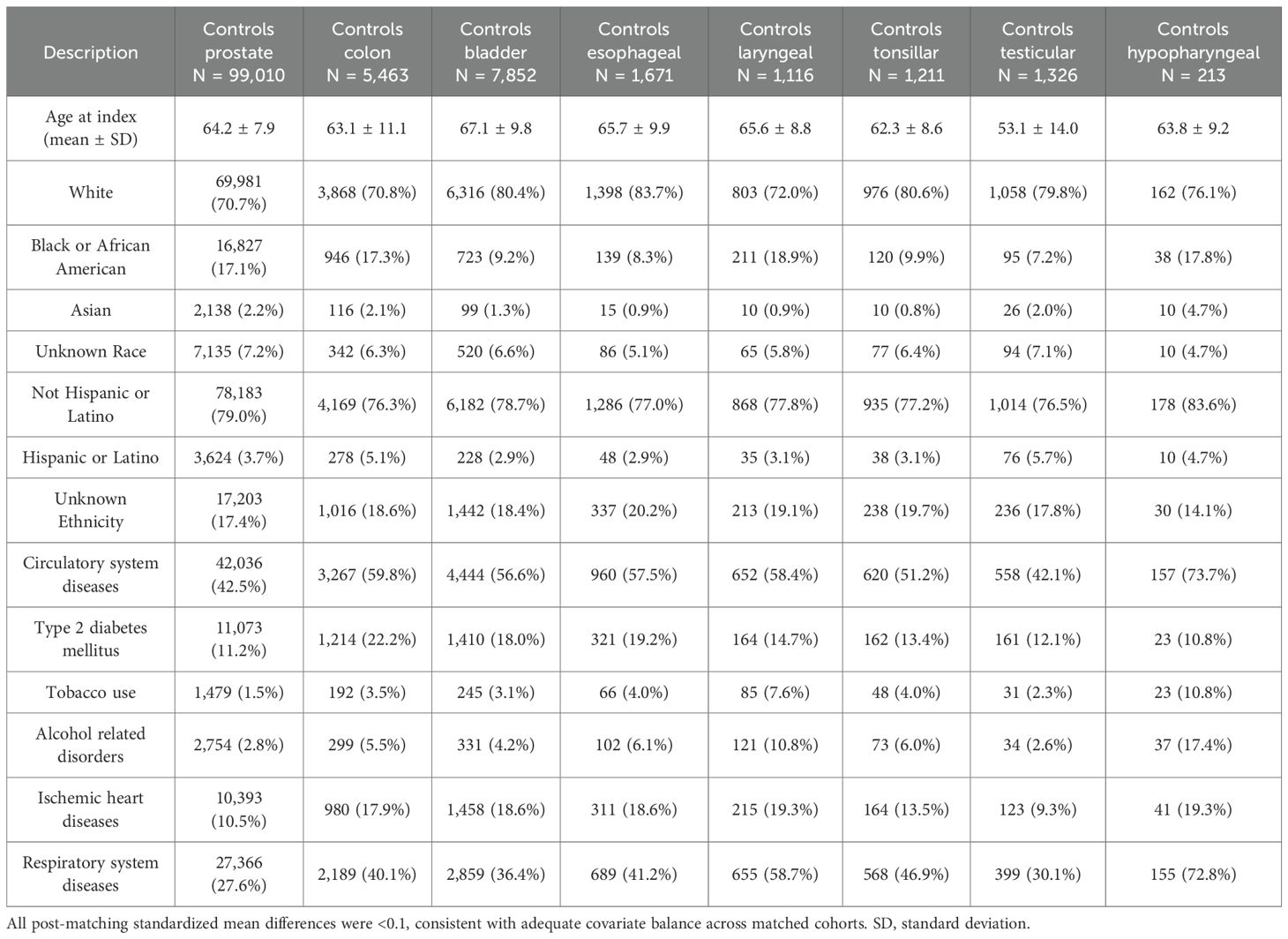 Table 5. Control cohort baseline characteristics for each cancer type, after propensity score matching (PSM).