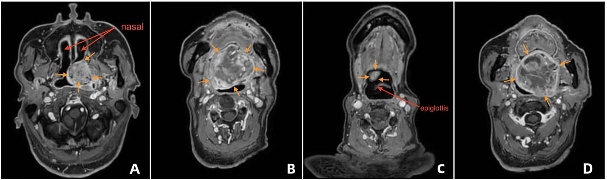 On imaging evaluation (MRI + CT), the right nasal cavity was patent, although the junction between the right nasal cavity and the nasopharynx was partially obstructed by the tumor, with the narrowest segment measuring approximately 7.2 mm (Figure 2A). No significant compression was noted in the laryngeal or epiglottic regions, and the anatomical integrity of the middle and lower airway segments was maintained (Figure 2B).