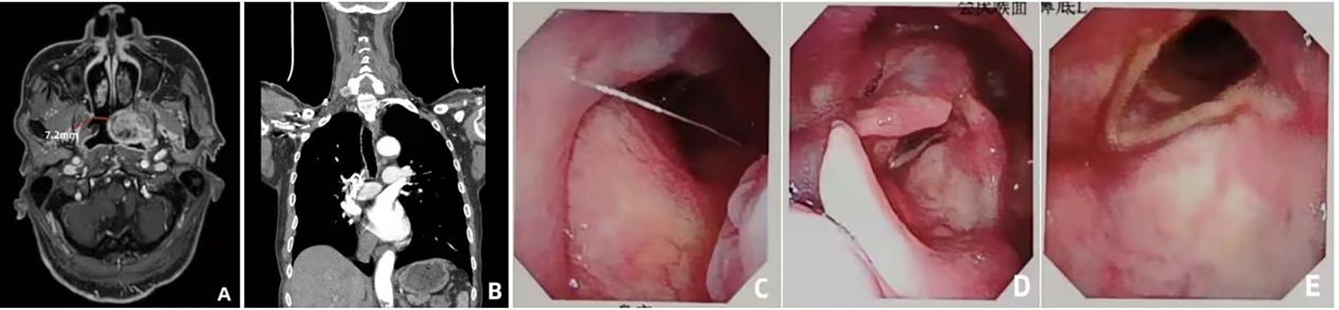Upon arrival in the operating theater, peripheral intravenous access was secured, and isotonic saline infusion was initiated. Electrocardiographic monitoring revealed oxygen saturation (SpO2) of 98%, heart rate (HR) of 77 bpm, and invasive arterial blood pressure of 154/65 mmHg via the left radial artery. Supplemental oxygen was administered via face mask at flow rate of 5 L/min; next, 0.5 mg penehyclidine hydrochloride was administered to reduce airway secretions. Dexmedetomidine was continuously infused at a dose of 1 μg/kg over 10 minutes to achieve conscious sedation. Cotton swabs moistened with 2% lidocaine were used for surface anesthesia of the right nostril, concurrently allowing assessment of nasal patency. Oropharyngeal mucosa was similarly anesthetized. An ultrasound-guided bilateral superior laryngeal nerve block was administered (3 ml of 2% lidocaine on each side) (4). Although spraying lidocaine through the working channel of a fiberoptic bronchoscope is considered a less invasive approach than cricothyroid membrane puncture, fiberoptic bronchoscopes equipped with such channels typically have a relatively larger outer diameter. Given that the narrowest segment of the patient’s airway measured only 7.2 mm, we were concerned that a thicker bronchoscope might cause airway bleeding. Thus, we opted for cricothyroid membrane puncture instead, spraying 3 ml of 2% lidocaine to effectively anesthetize the tracheal mucosa and ensure patient comfort during intubation. A fiberoptic bronchoscope was inserted through the right nostril and advanced through the nasal cavity. The angle of the endoscope body was adjusted continuously and it was slowly advanced along the right edge of the tumor, allowing visualization of the pharyngeal structures. During the inspiratory phase, the glottis was clearly visualized. The patient was instructed to inhale, facilitating endoscopic advancement into the trachea. Upon identification of the tracheal rings and carina, a 6.0# reinforced wire endotracheal tube was inserted, and its placement was reconfirmed. The patient remained cooperative, calm, and exhibited no significant coughing or movement. After successful intubation, intravenous administration of remimazolam (10 mg), sufentanil (20 μg), and cisatracurium (12 mg) was performed. The endotracheal tube was secured and connected to the anesthesia workstation for mechanical ventilation.