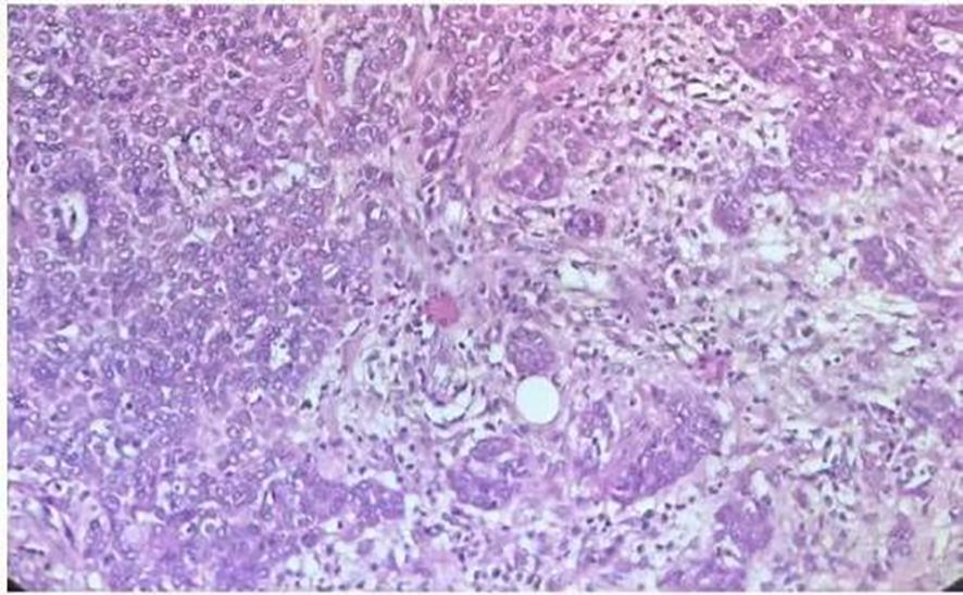Figure 3. Hematoxylin and eosin-stained(×200)section showing features of pleomorphic adenoma with invasive growth characteristics.