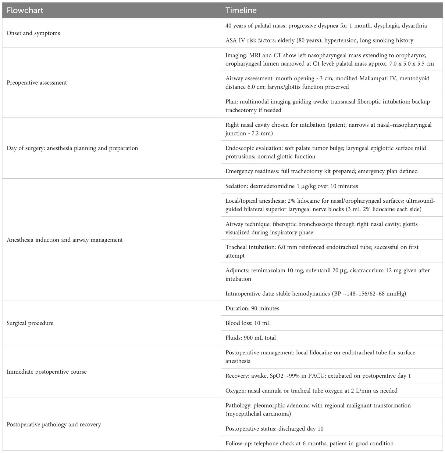 In conclusion, this case demonstrates that multimodal imaging-guided awake transnasal fiberoptic intubation successfully addressed the airway challenges in an 80-year-old ASA Grade IV patient with a giant palatal pleomorphic adenoma. By avoiding invasive tracheotomy and leveraging evidence-based sedation and anesthesia techniques, this approach achieved optimal safety and patient outcomes, providing a practical framework for managing similarly complex cases.