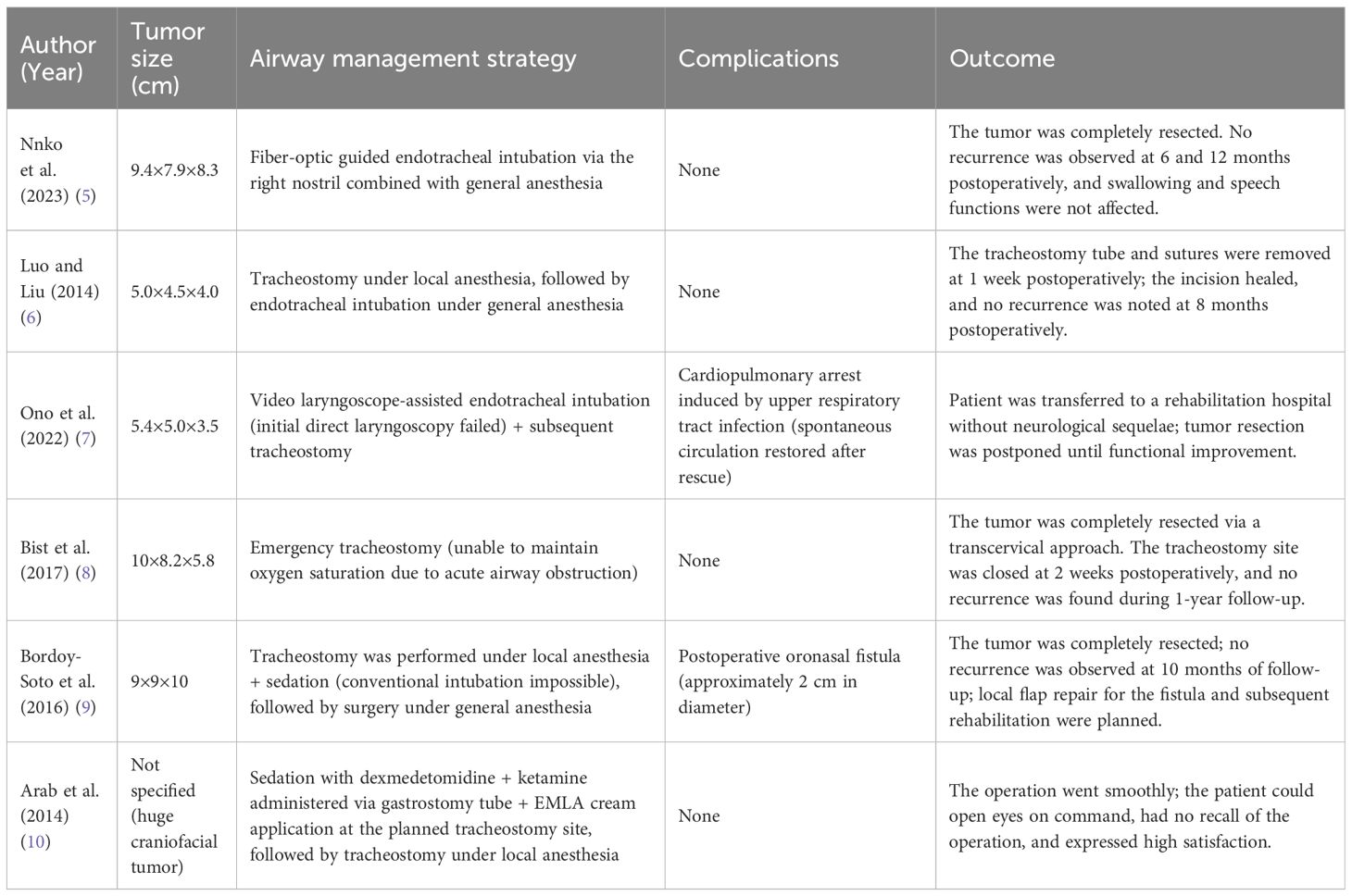 To inform our anesthesia plan with prior clinical experience, we systematically reviewed six published cases of giant palatal and parapharyngeal pleomorphic adenomas (maximum tumor diameter > 5 cm) reported between 2010 and 2024, focusing on airway management strategies and outcomes (Table 2) (5–10). Among them, four cases (66.7%) required elective or emergency tracheotomy to secure perioperative ventilation due to airway compromise from tumor compression or obstruction; one case achieved successful intubation via right nasal fiberoptic laryngoscopy without tracheotomy (5); while another case initially failed direct laryngoscopy intubation (Cormack-Lehane Grade 3), succeeded with video laryngoscope assistance, and subsequently underwent delayed tracheotomy for rehabilitation (7).