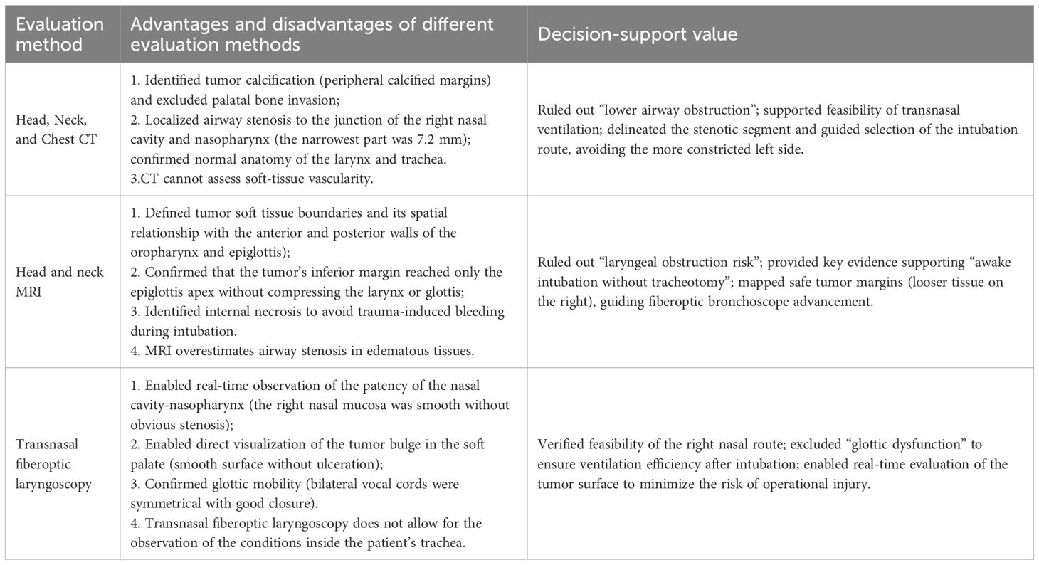 A key insight from this case is that multimodal imaging forms the foundation for precise airway management. Conventional assessments—such as mouth opening, mentohyoid distance, and Mallampati classification—offer only superficial insights. In contrast, the integrated use of MRI, 3D CT reconstruction, and fiberoptic laryngoscopy enables a comprehensive three-dimensional mapping of the airway, facilitating a safe and minimally invasive airway strategy. The advantages and disadvantages of different imaging examinations in airway evaluation are detailed in Table 3. Collectively, the experience from previous literature and the success of this case indicate that awake intubation is not universally safe or applicable. Its success depends fundamentally on comprehensive and objective preoperative evaluation of airway anatomy.