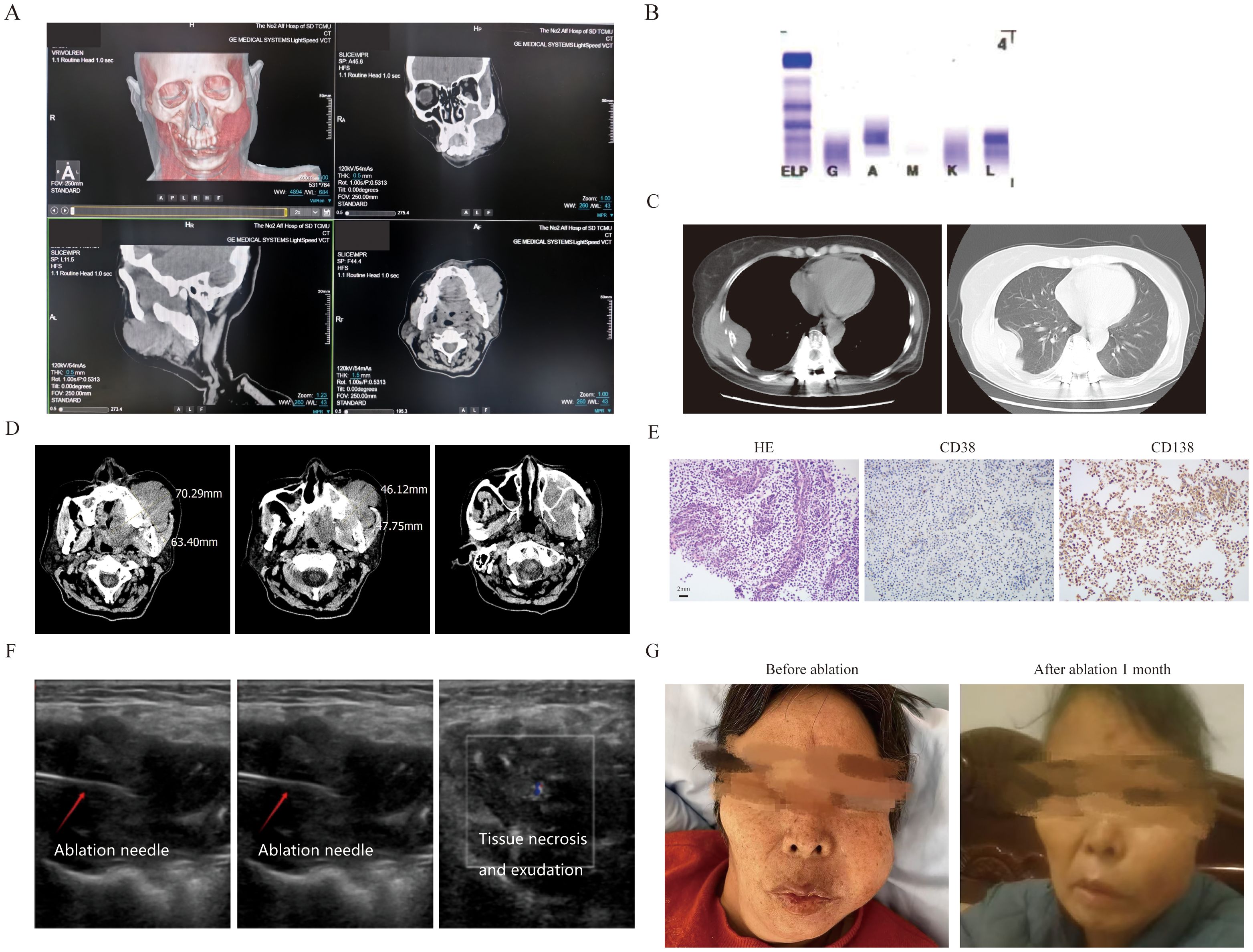 Figure 1. The clinical data of patient 1. (A) Three-dimensional CT imaging of the left face. (B) The immunofixation electrophoresis image. (C) The extramedullary lesion beside the rib. (D) The extramedullary lesion on the left side of the face scanned by CT before ablation treatment. (E) The pathological image of the extramedullary lesion on the left face(20×original magnification). (F) The process of microwave ablation under color ultrasound guidance. The first picture shows the position where the ablation needle reached, the second picture shows the start of the ablation process, and the third picture shows the moment after the ablation is completed and the ablation needle has been withdrawn. (G) The extramedullary lesion on the left side face before and after microwave ablation treatment.