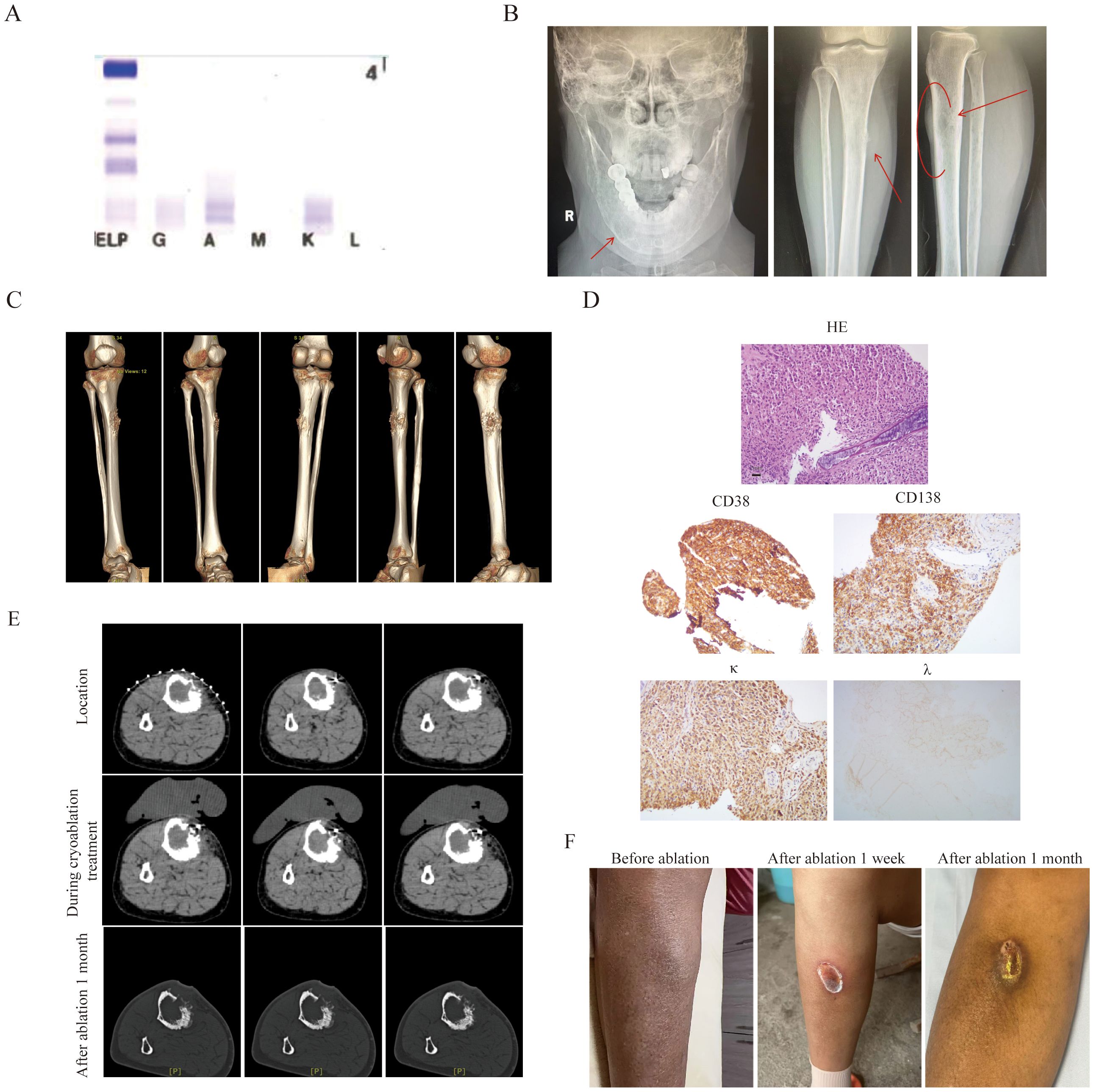 Figure 2. The clinical data of patient 2. (A) The immunofixation electrophoresis image. (B) The extramedullary lesion of mandible and anterior side of the tibia. (C) Three-dimensional stereoscopic imaging of extra-membranous lesions of the tibia. It can be observed that this extramedullary lesion grows out from the bone cortex. (D) The pathological image of the extramedullary lesion(20×original magnification). (E) The extramedullary lesion CT scan pictures before and after cryoablation treatment.To prevent frostbite, insulating pads were used on the skin during cryoablation. (F) The tibia pictures before and after ablation treatment.