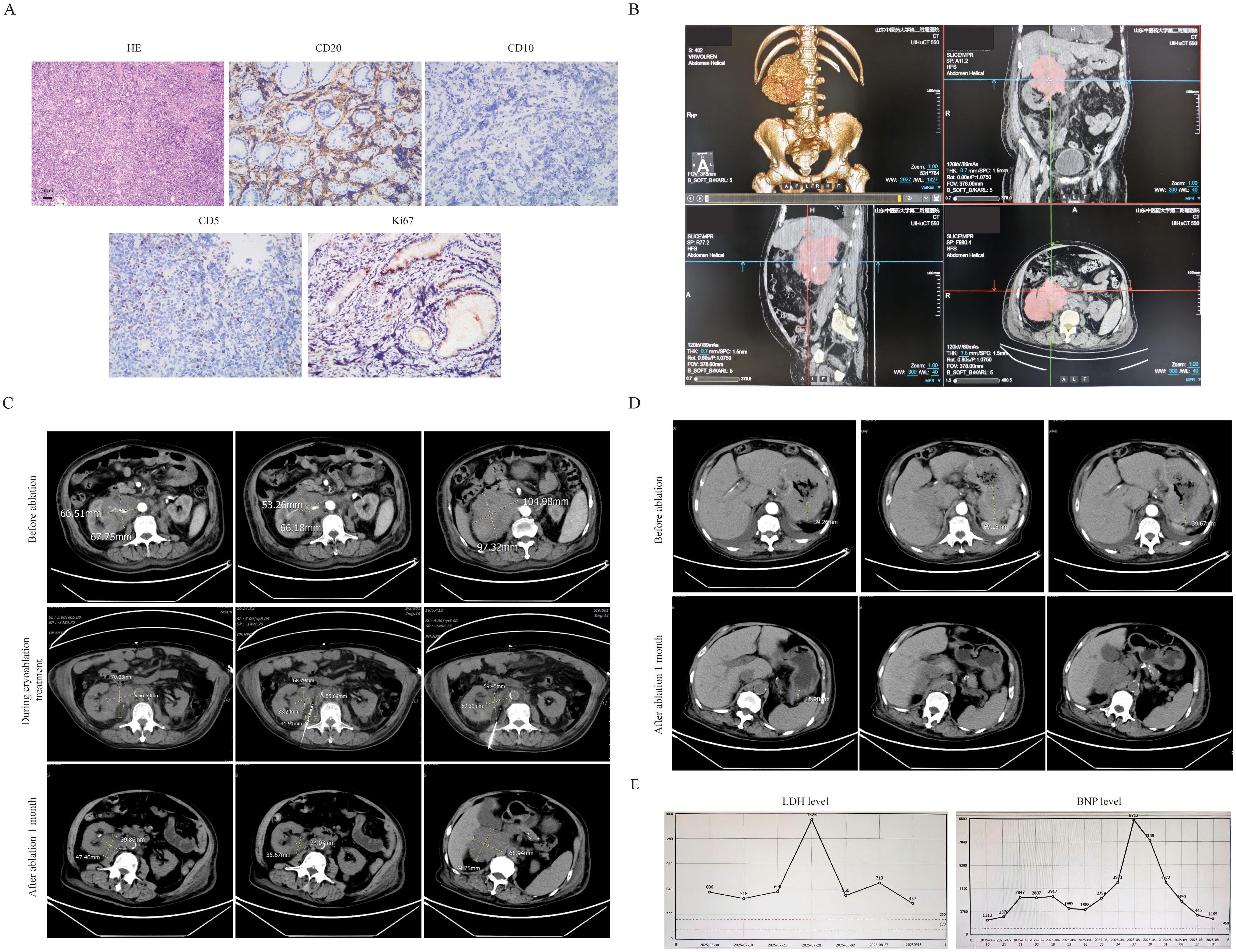 The third patient was an 83-year-old male diagnosed by gastroscopic pathology as diffuse large B-cell lymphoma (DLBCL, Stage IV, high-risk with an International Prognostic Index(IPI) score of 5). The key challenge in this patient’s treatment was a large retroperitoneal mass measuring 9.1 cm × 9 cm, which encased the renal artery and caused renal compression (Figure 3A). Laboratory tests revealed a lactate dehydrogenase (LDH) level of 1523 U/L and a B-type natriuretic peptide (BNP) level of 8712 pg/mL. The patient required prolonged bed rest, was unable to walk independently, had an Eastern Cooperative Oncology Group (ECOG) performance status score of 4, and an Activities of Daily Living (ADL) score of 20.After the pathology of retroperitoneal mass was confirmed as also DLBCL (Figure 3B), treatment was administered as the R-miniCHOP regimen combined with cryoablation of the retroperitoneal mass. Under CT guidance, a 24G cryoprobe was inserted into the mass, and two freeze-thaw cycles were conducted using Argon-Helium Cryosurgical System—each cycle consisting of 15 minutes of freezing followed by 3 minutes of thawing. The ablation zone included a 5–10 mm margin around the targeted mass (Figure 3C). No serious adverse events occurred during the ablation procedure. After 2 cycles of R-miniCHOP, the treatment response was evaluated as partial remission (PR). The size of the retroperitoneal mass was 4.7×3.9cm (Figure 3C), the thickness of the stomach wall also decreased from 6.9 cm to 1.5 cm (Figure 3D), the LDH level decreased to 457 U/L, and the BNP level dropped to 1169 pg/mL (Figure 3E). The patient’s frailty improved significantly, with an ECOG score of 3 and an ADL score of 60.