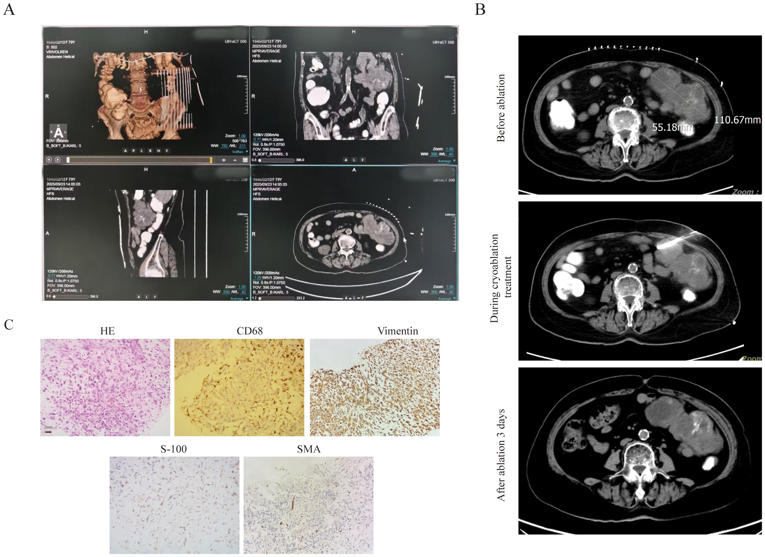 The fourth patient was an 80-year-old female diagnosed with DLBCL (Stage IVB). On November 22, 2024, lymph node aspiration biopsy confirmed DLBCL of the germinal center subtype. Immunohistochemical (IHC) results showed: CD20 (+), CD5 (+), CD10 (-), MUM-1 (focal +, <10%), Bcl-6 (+, >30%), Bcl-2 (+), CD3 (focal +), CD21 (-), P53 (30%), CD30 (rare +, <1%), C-MYC (30%), Ki-67 (80%); in situ hybridization (ISH) revealed EBER (-). Flow cytometry of bone marrow aspiration detected 1.09% monoclonal B lymphocytes. The patient’s treatment history was as follows: One cycle of R-CHOP (rituximab-CHOP), five cycles of zuberituzumab-CHOP administered, one cycle of Pola-BR. The patient achieved CR after the above treatments and was subsequently placed on maintenance therapy with oral lenalidomide. In early September 2025, the patient developed a left abdominal mass accompanied by distending pain. CT scans showed multiple lymph nodes in the abdominal cavity and retroperitoneum, with the largest lesion located on the left side of the abdomen (measuring 10.8 cm × 6.1 cm). The mass contained patchy low-density areas and punctate high-density areas, with a slightly larger range than in previous scans, and was closely associated with surrounding intestinal loops. Enhanced CT also showed positivity in some lymph nodes, suggesting disease recurrence. On September 9, the patient was initiated on Pola-BR + selinexor therapy. Considering the patient’s advanced age, frailty, significant myelosuppression (neutropenia and thrombocytopenia) from prior chemotherapy (rendering her unable to tolerate more intensive regimens), and the risk of radiation enteritis with radiotherapy to this region, cryoablation of the intra-abdominal mass was combined with systemic therapy. Before treatment, the patient had an ECOG score of 3 and an ADL score of 40.Details of the cryoablation procedure: First, contrast agent was administered orally 1.5 hours before ablation, then CT 3D reconstruction was used to further clarify the anatomical relationship between the intestinal tract and the mass (Figure 4A). Prior to ablation, tissue biopsy was performed, and approximately 30 ml of liquefied necrotic fluid was aspirated from the target area. Then, under CT guidance, a 24G cryoprobe was inserted into the mass, and two freeze-thaw cycles were conducted—each cycle consisting of 15 minutes of freezing followed by 3 minutes of thawing (Figure 4B). After treatment, the patient’s pain was significantly relieved, with an ECOG score of 2 and an ADL score of 65. Subsequent pathological examination of the intra-abdominal mass confirmed synovial sarcoma. IHC results for the synovial sarcoma were: Vimentin (+), EMA (+), CK (+), CD68 (+), CD10 (+), bcl-2 (focal cytoplasmic +), CD117 (-), Dog-1 (-), CD34 (vascular +), S100 (-), SMA (-), desmin (-), WT-1 (-), CK5/6 (-), D2-40 (-), and a Ki-67 proliferation index of 70% (Figure 4C). A combined regimen targeting both lymphoma and synovial sarcoma—Pola-R-CHP —was administered in combination with local cryoablation. After 1 cycle of this treatment, the patient’s condition improved further.