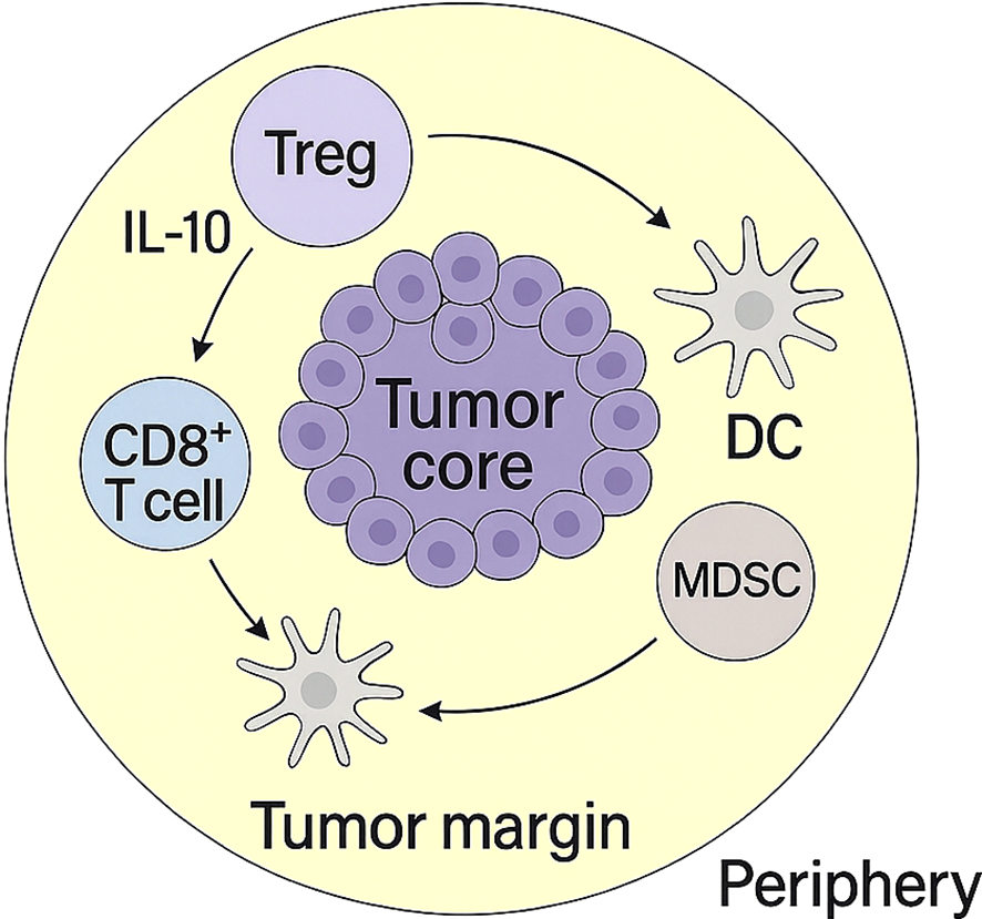 Spatial organization of immunosuppressive cells in the tumor microenvironment. CD39+PD-1+ Tregs, dendritic cells (DCs), MDSCs, and CD8+ T cells are distributed across the tumor core, margin, and periphery. This spatial structure underlies coordinated immune suppression and T cell exclusion.