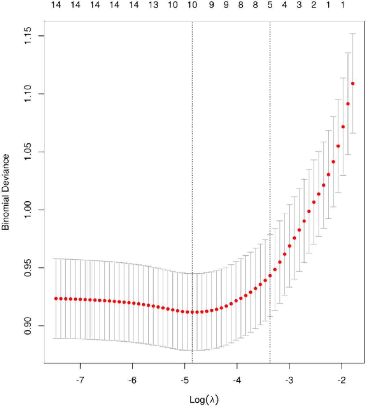 To further prevent variable overfitting, this study incorporated variables with a p-value < 0.2 from the univariate analysis into a LASSO regression model for secondary screening. The optimal model was determined based on cross-validation, ultimately identifying the core predictive factors for neuropathic pain following thoracic oncology surgery.