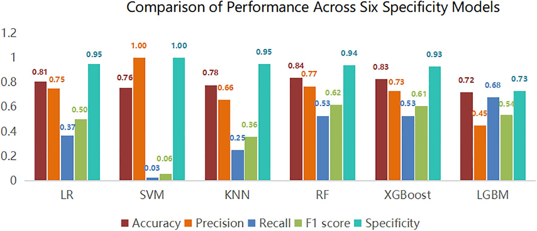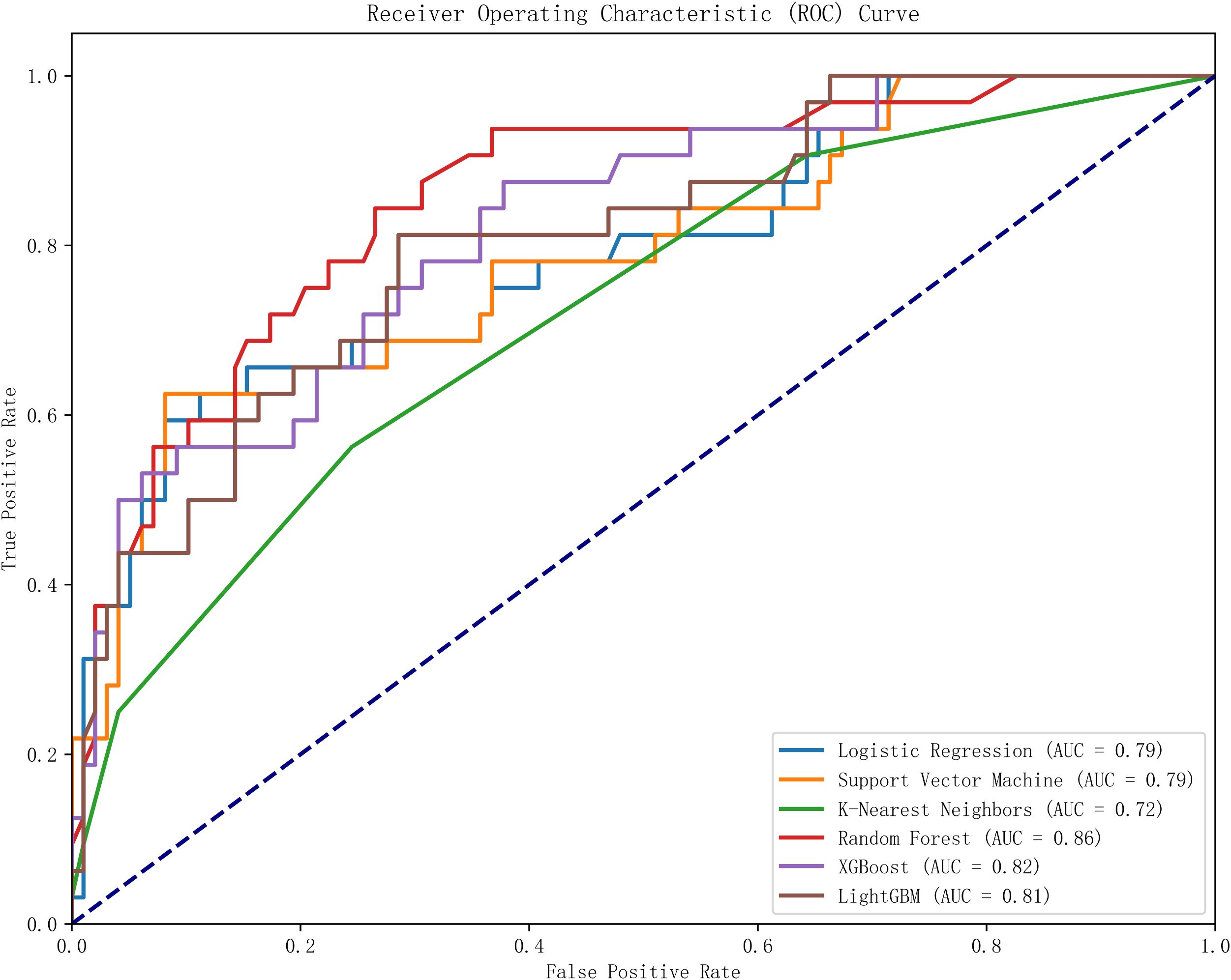 Random Forest, as an ensemble learning method, enhances model accuracy and robustness by integrating the predictions of multiple decision trees, while also demonstrating strong resistance to overfitting. When dealing with high-dimensional data or small sample sizes, this model typically maintains good generalization performance. The results of this study indicate that the Random Forest model exhibits strong competitiveness across various evaluation metrics; it excels not only in discriminatory power (AUC) but also achieves a favorable balance between sensitivity and specificity, highlighting its clear advantages in classification tasks.