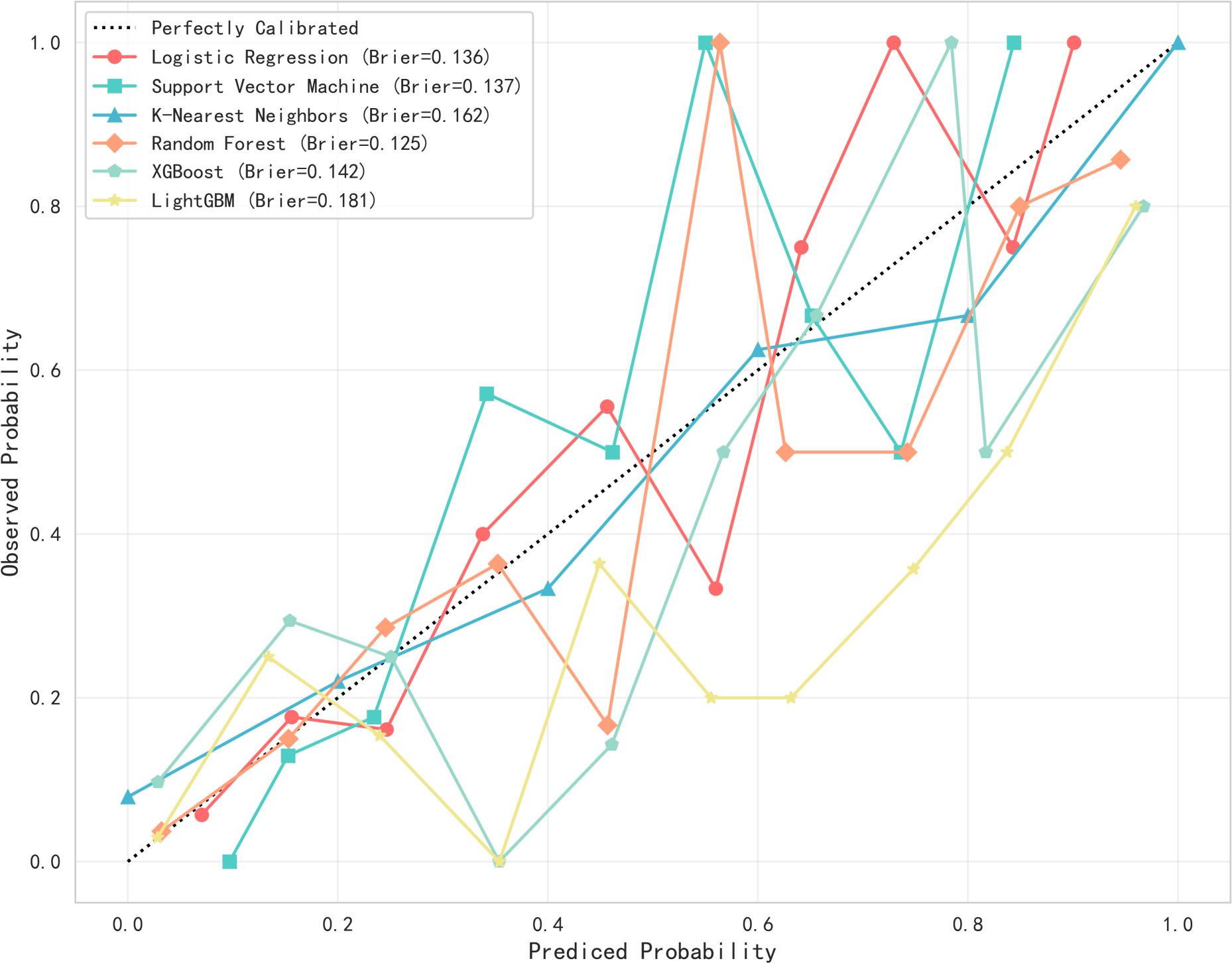 Figure 4. The calibration curves of six models. Probability calibration curves for six machine learning models. The x-axis represents the predicted probabilities from the models, while the y-axis shows the actual observed probabilities. The diagonal line indicates the reference line for perfect calibration. The Brier score (with lower values indicating better performance) reveals that the random forest model (0.125) exhibits the best calibration performance.