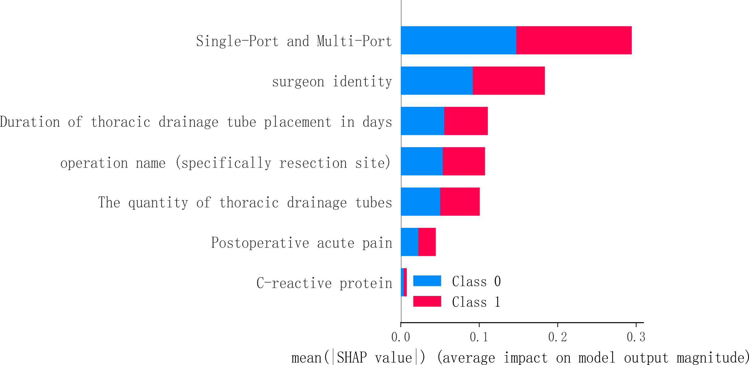 To identify the most influential features in the model predictions, we performed a visual analysis using SHAP (SHapley Additive exPlanations) values. This analysis was applied to the Random Forest (RF) model, revealing the following key features, ranked by their mean absolute SHAP value: Single-port and multi-port (0.147), surgeon identity (0.092), duration of thoracic drainage tube placement in days (0.055), operation name (0.053), the quantity of thoracic drainage tubes (0.050), postoperative acute pain (0.022), and CRP (0.004). The results are visualized in Figure 5.