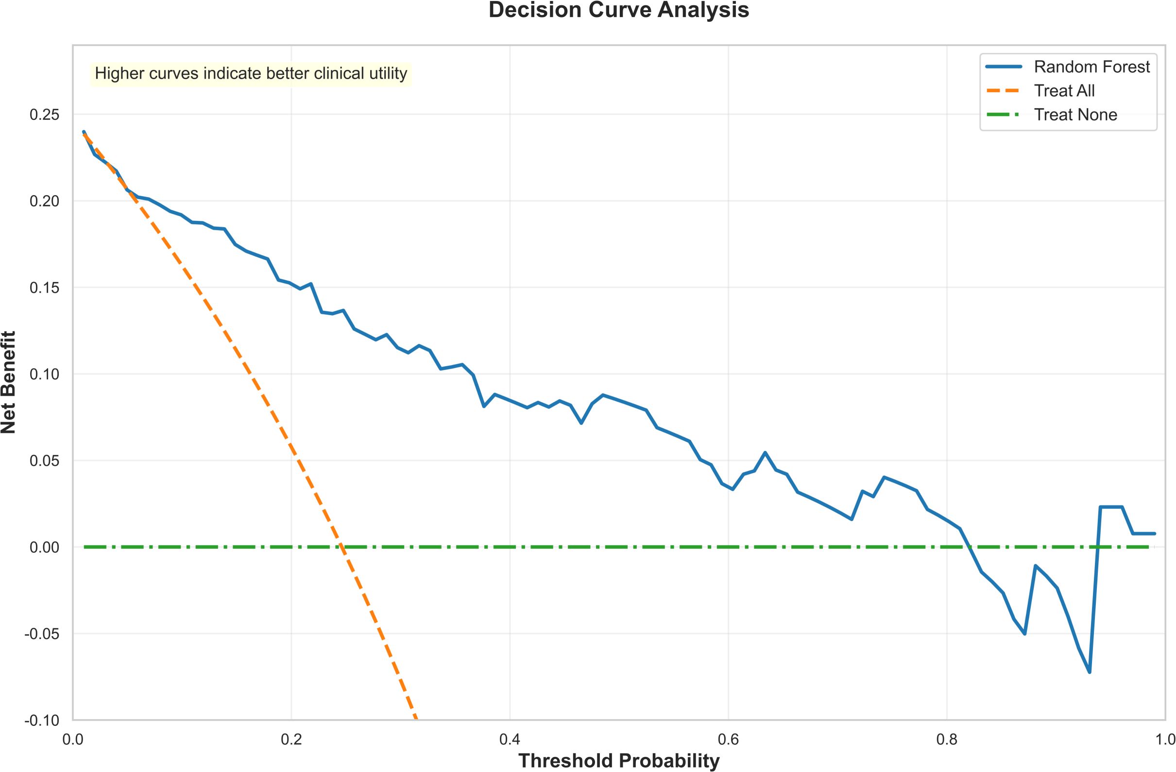 Compared to traditional logistic regression models, the Random Forest model can also incorporate feature importance analysis and SHAP values, effectively revealing the decision-making mechanisms of the model. Additionally, we conducted decision curve analysis for the RF model, which demonstrates its substantial clinical utility and ability to assist physicians in making better-informed decisions in most scenarios, as illustrated in Figure 6.
