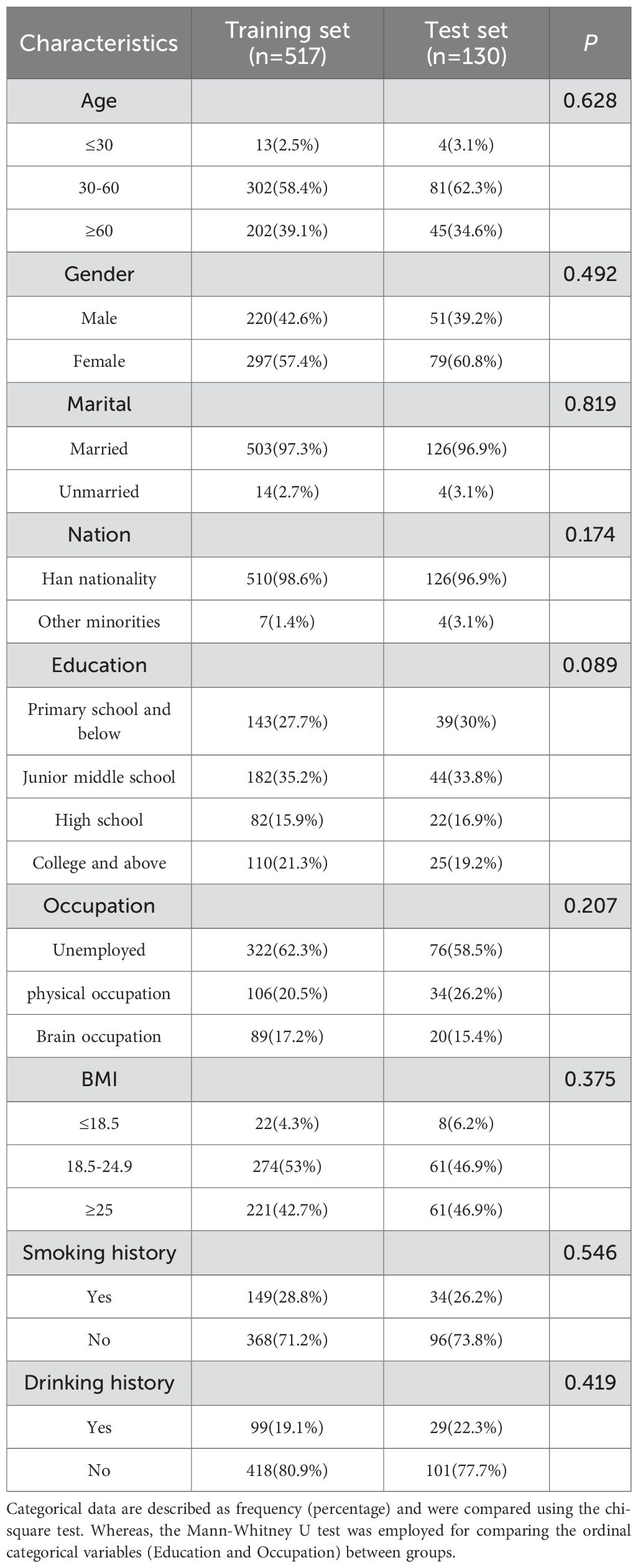This study ultimately comprised 647 neuropathic pain following thoracic oncology surgery patients, who were randomly segregated into a training set (517 cases) and a test set (130 cases), in an 8:2 ratio. The general demographic data for both groups are presented in Table 2. It can be inferred that there is no statistically significant difference in the distribution of age, gender, marital status, BMI, education level, ethnicity, and occupation between the training and test sets (P>0.05).