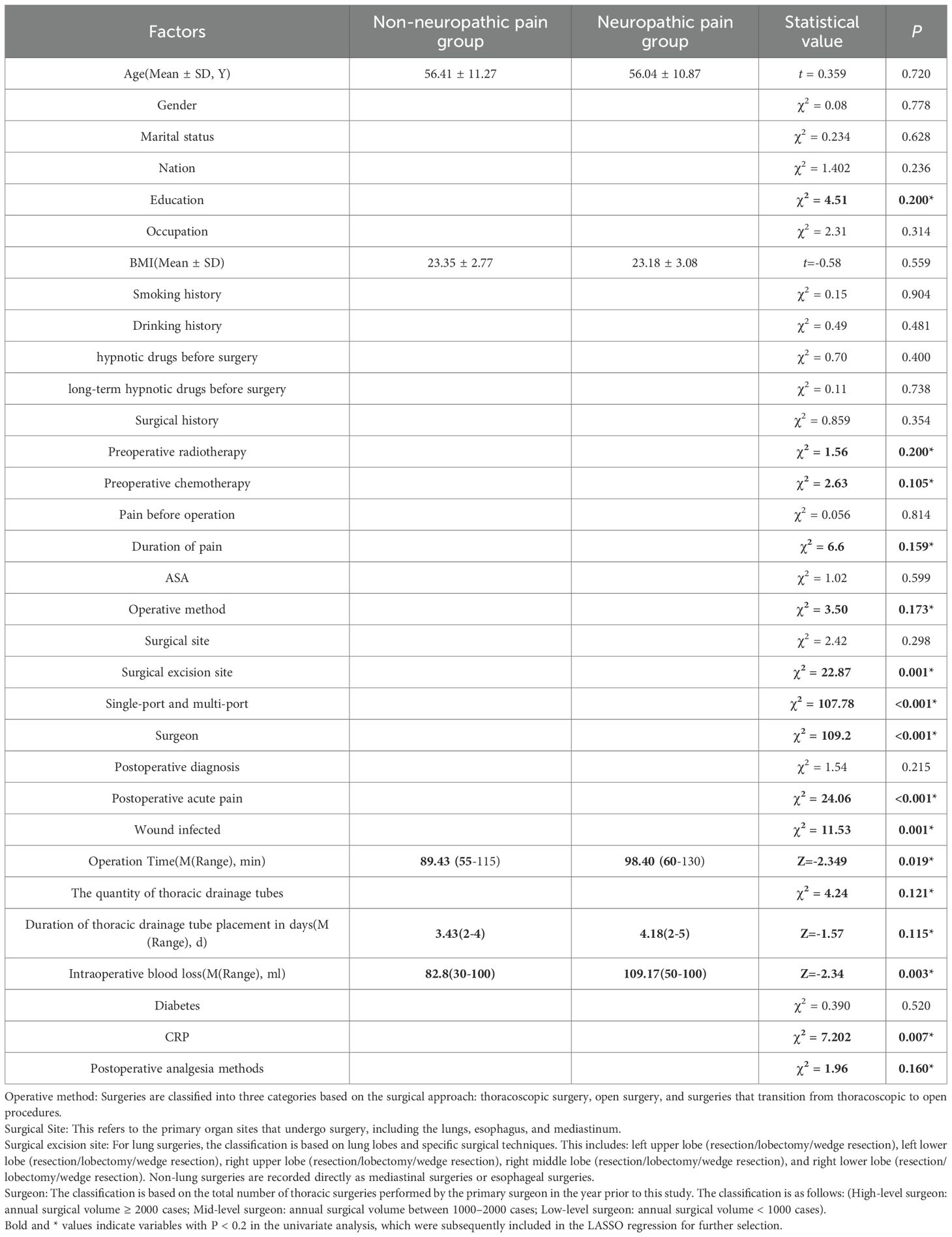 During the data analysis phase, this study employed univariate analysis to identify factors influencing perioperative neuropathic pain in patients with thoracic oncology. Specifically, categorical variables (such as gender and marital status) were analyzed using the Pearson chi-square test; normally distributed numerical variables were assessed using the t-test; and non-normally distributed numerical variables were evaluated with the Mann-Whitney U test. To encompass potentially significant variables and avoid omitting important factors, variables with a p-value < 0.2 in the univariate analysis were considered statistically significant. This approach is supported by relevant academic papers, master’s theses, and professional textbooks (23–25), which commonly suggest that using a more lenient p-value (e.g., p < 0.2) in preliminary variable selection can help identify variables that may be overlooked with stricter thresholds, thereby enhancing the accuracy and robustness of subsequent models.