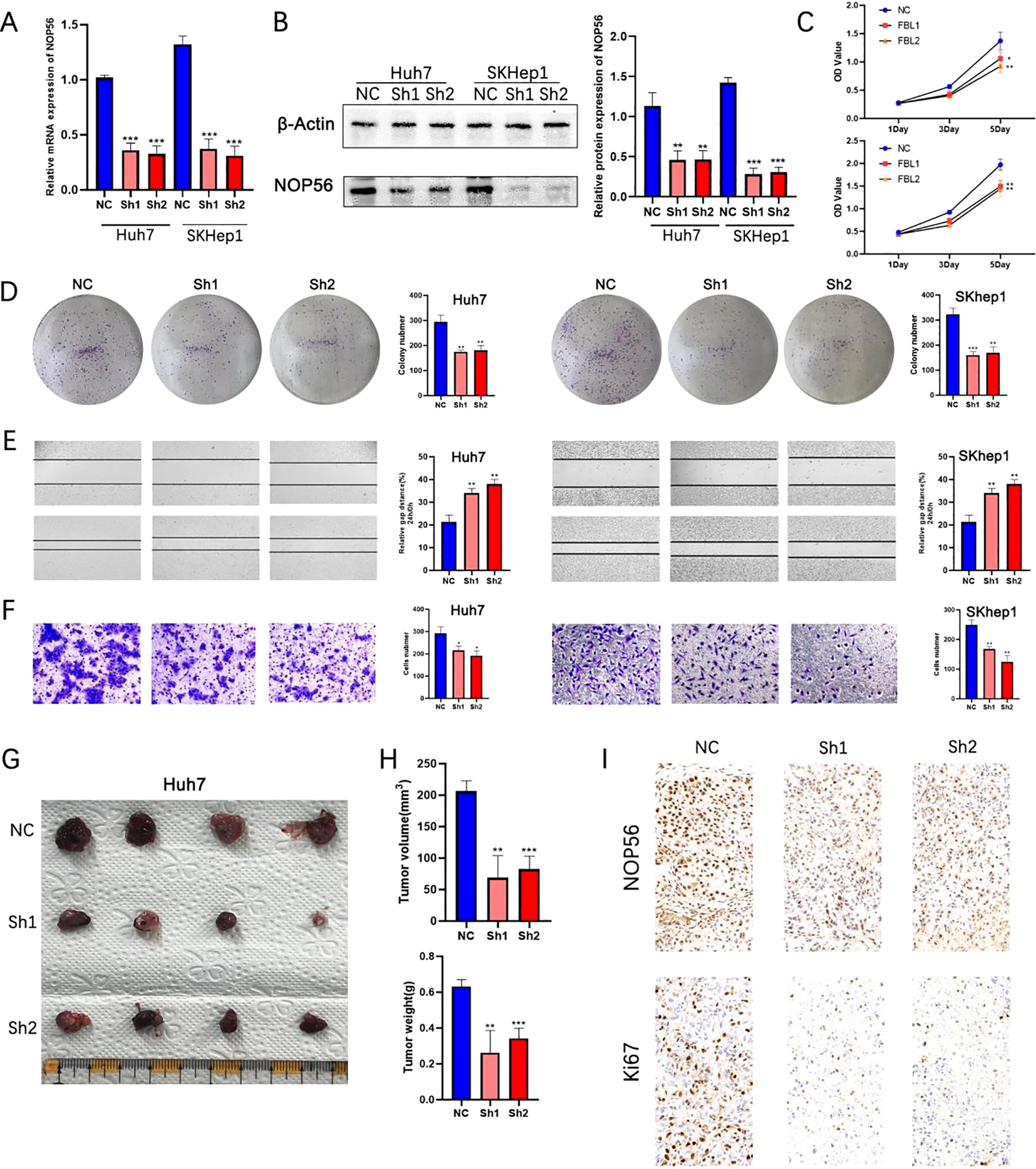 Figure 5. Silencing of NOP56 suppresses proliferation, migration, and tumorigenicity of HCC cells in vitro and in vivo. (A) qRT-PCR analysis of NOP56 mRNA levels in Huh7 and SKhep1 cells transduced with control (NC) or NOP56-targeting shRNAs (Sh1, Sh2). (B) Western blot analysis of NOP56 protein levels with β-actin as a loading control; quantification shown on the right. (C) Growth curves showing reduced proliferation in NOP56-knockdown cells compared with NC. (D) Representative images and quantification of colony formation assays. (E) Wound-healing assays showing impaired migration after NOP56 knockdown. (F) Transwell migration assays confirming reduced migratory capacity. (G–H) Representative xenograft tumors, tumor volume, and weight measurements from nude mice injected with Huh7 cells expressing NC or NOP56 shRNAs. (I) Immunohistochemical staining of NOP56 and Ki-67 in xenograft tumor tissues. Data were shown as mean ± SD. *: p < 0.05, **: p < 0.01, ***: p < 0.001.