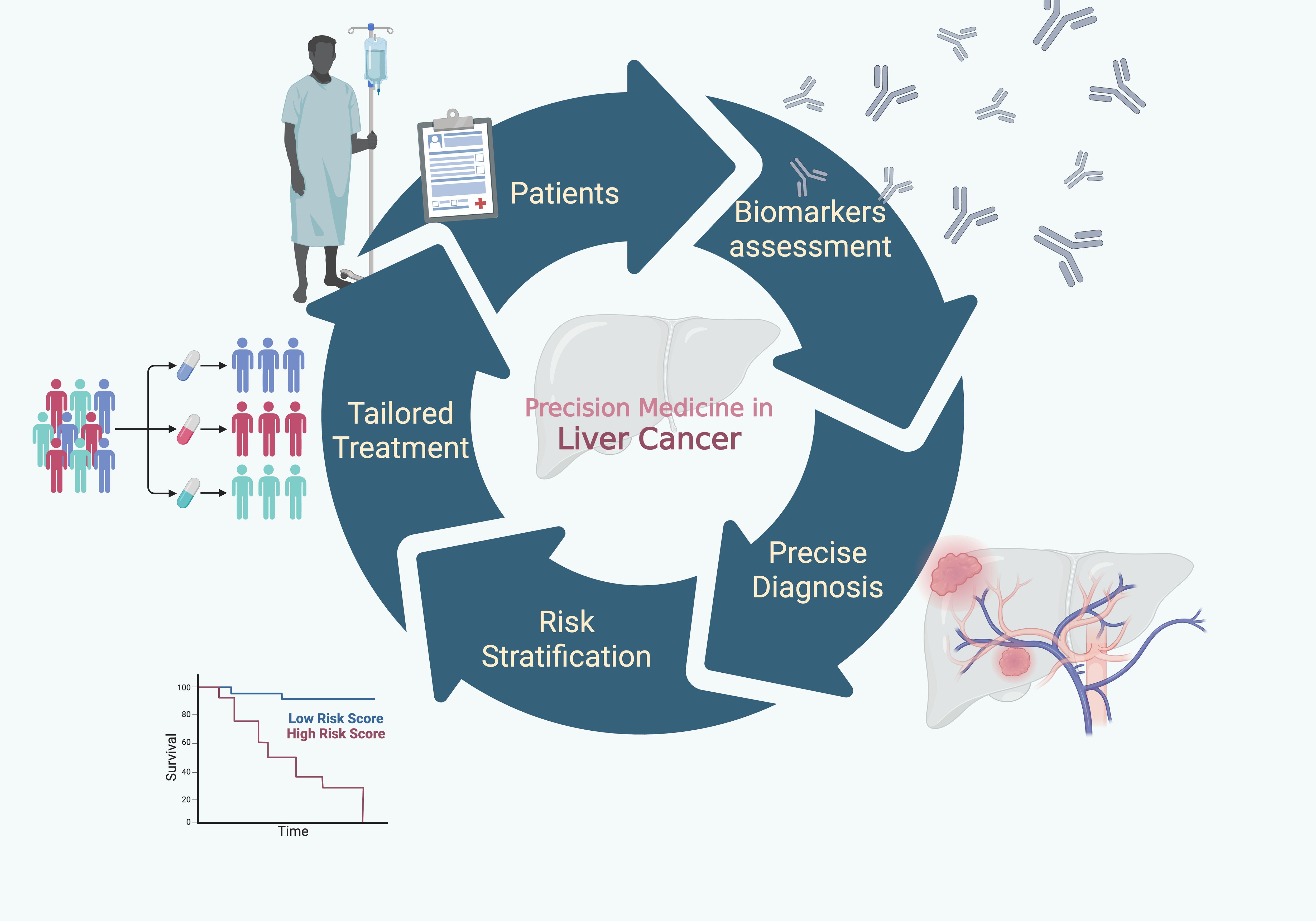 Figure 1. Towards precision medicine: Conceptual framework of precision medicine in primary liver cancer. The pathway from biomarker assessment to precise diagnosis, risk stratification, and tailored treatment illustrates how molecular and clinical indicators guide individualized therapeutic strategies, ultimately aiming to improve patients’ survival outcomes.