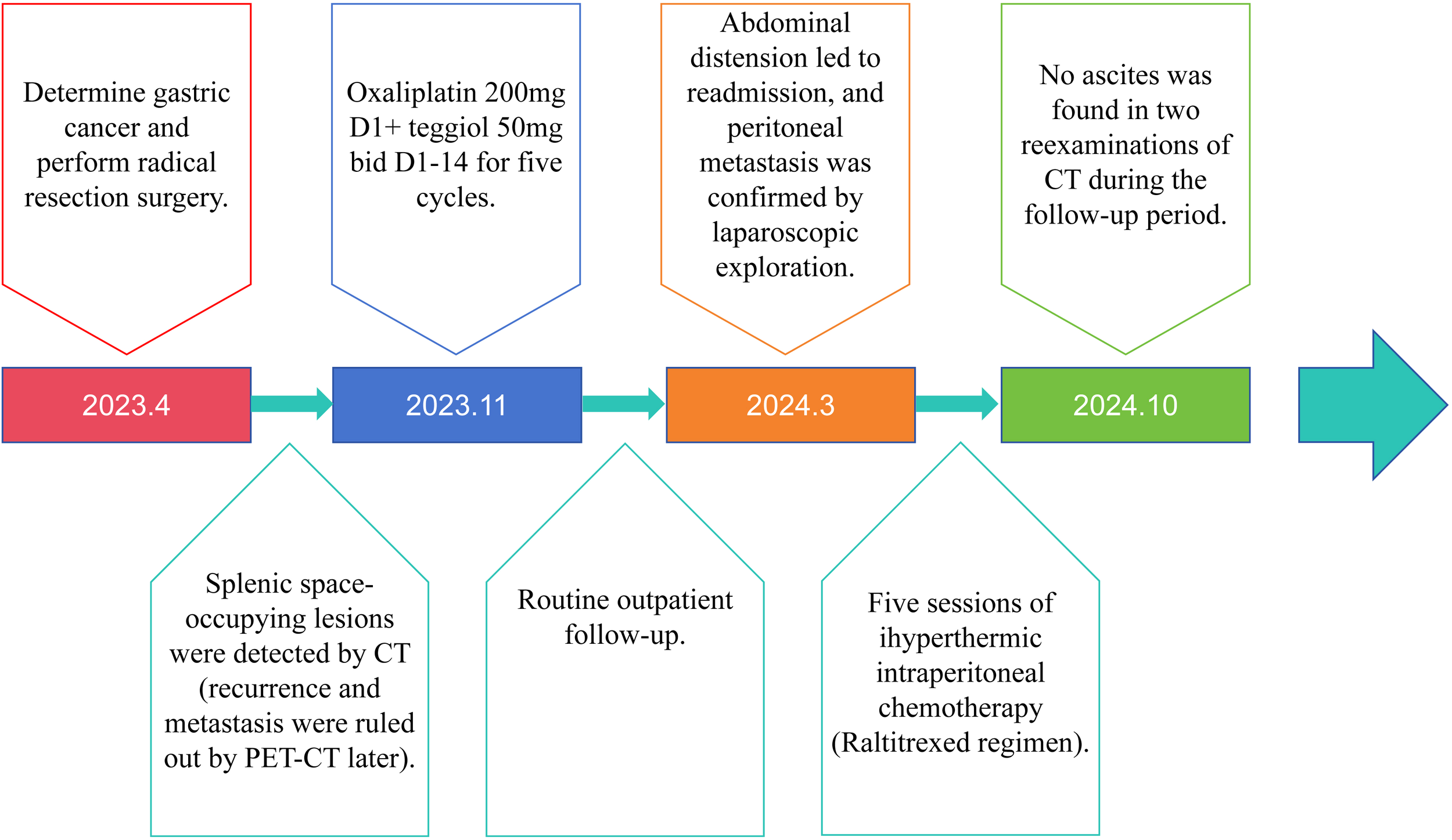 Following regular outpatient surveillance, the patient was readmitted to the hospital due to “abdominal distension for 7 days” on March 12, 2024. Physical examination on admission showed a distended abdomen, frog-like abdomen, old surgical scars on the abdomen, soft and non-tender, and other abnormalities. Abnormal laboratory findings included: hemoglobin, 94g/L (normal 130-175g/L); Albumin, 30.9g/L (normal 40-55g/L); K, 2.77mmol/L (normal 3.5-5.5mmol/L); CA-125: 59.7U/ml (normal 0-30.2U/mL). Enhanced abdominal CT revealed a massive peritoneal fluid collection (Figure 2B). Due to the late stage of the tumor, the possibility of tumor recurrence was considered, and the exfoliative cytology of the tumor was performed twice; the results were negative. After the MDT discussion, laparoscopic exploration was recommended. The reasons included: First, after radical total gastrectomy, the stage was adenocarcinoma of the gastric body (pT4aN3bM0, III stage), and the recurrence rate was very high; Second, no malignant tumor cells were found in two exfoliative cytology examinations; Third, laparoscopic exploration can help to confirm whether it is recurrent gastric cancer and guide the follow-up strategy; Fourth, patients may benefit from HIPEC treatment of recurrent GC.