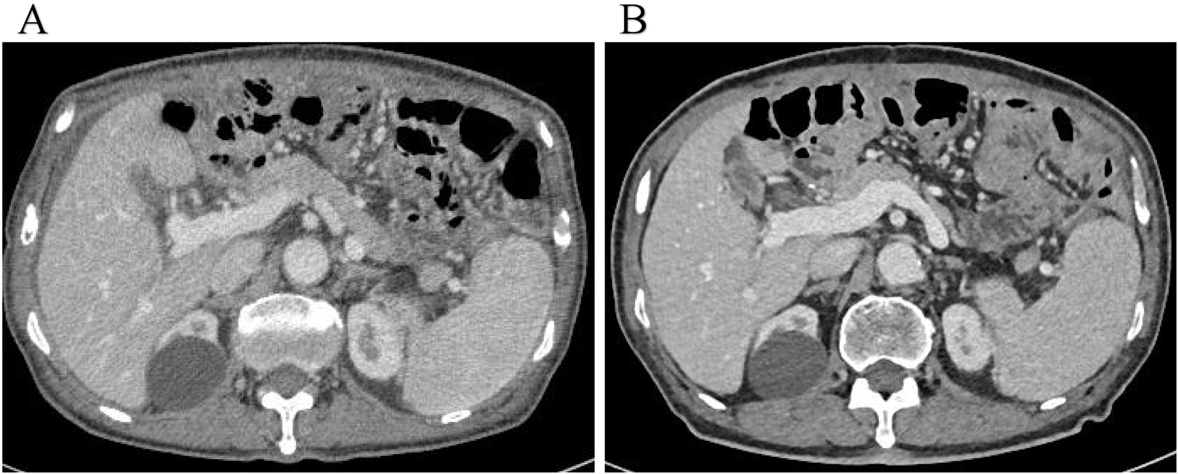 (A, B) Surveillance abdominal CT scans performed in May and October 2024 showed no recurrence of ascites.
