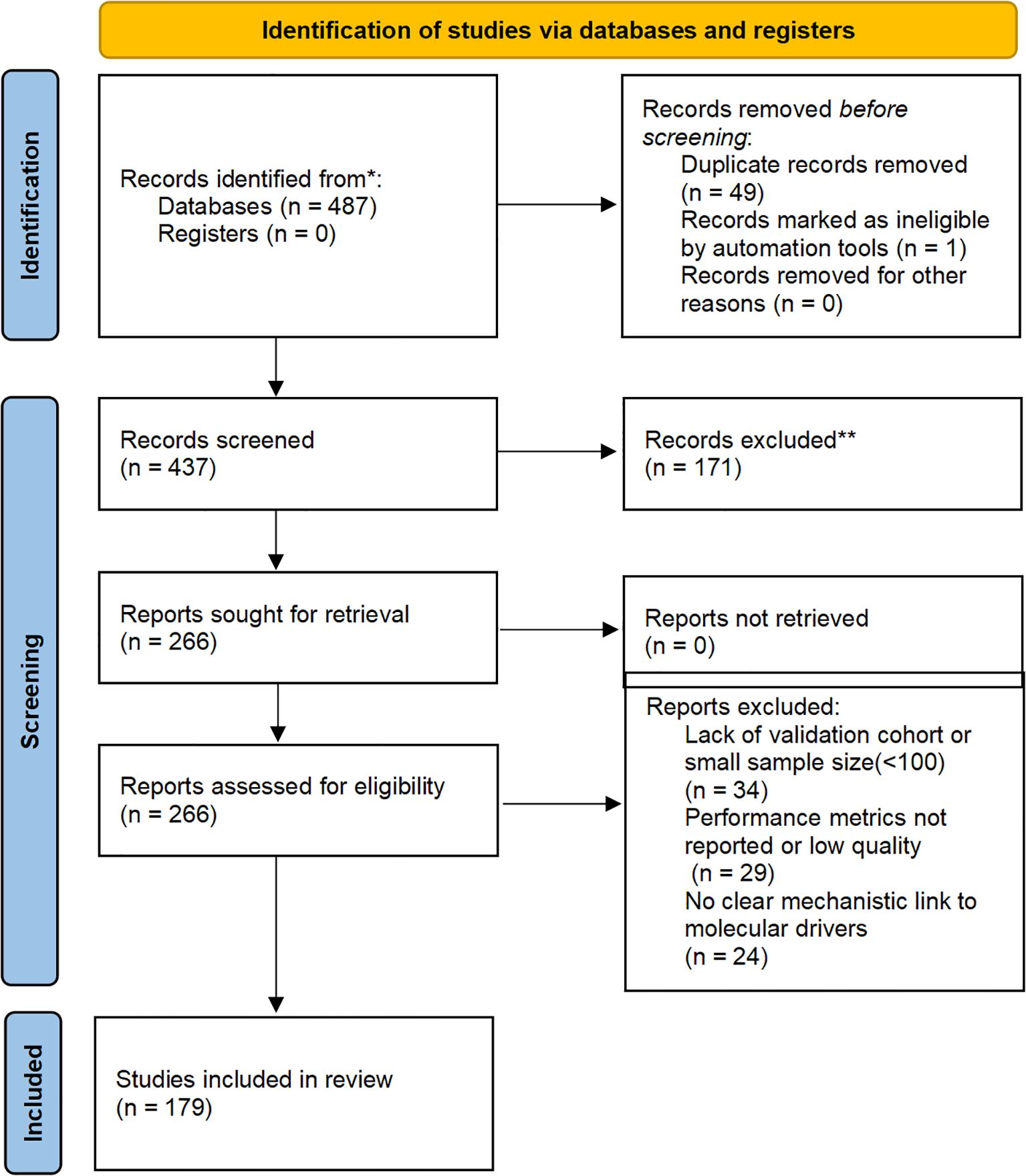 To enhance transparency in our narrative review, we conducted a structured literature search across PubMed, Scopus, Web of Science, and Google Scholar from January 2020 to October 2025. Search terms included combinations such as “AI gynecologic oncology,” “radiogenomics ovarian cancer,” “digital biopsy cervical cancer,” and “molecular imaging endometrial cancer.” Inclusion criteria focused on peer-reviewed articles applying AI/deep learning to radiological imaging (CT, MRI, PET) or digital pathology for molecular profiling in ovarian, endometrial, or cervical cancers, with at least retrospective validation (≥100 patients preferred), performance metrics (e.g., AUC ≥0.70), and explicit mechanistic links to drivers like HRD or MSI. From 487 initial records, duplicates were removed (n=50 excluded), titles/abstracts screened (n=171 excluded), and full-texts assessed (n=87), yielding 179 key studies for synthesis. The process is illustrated in Figure 1.