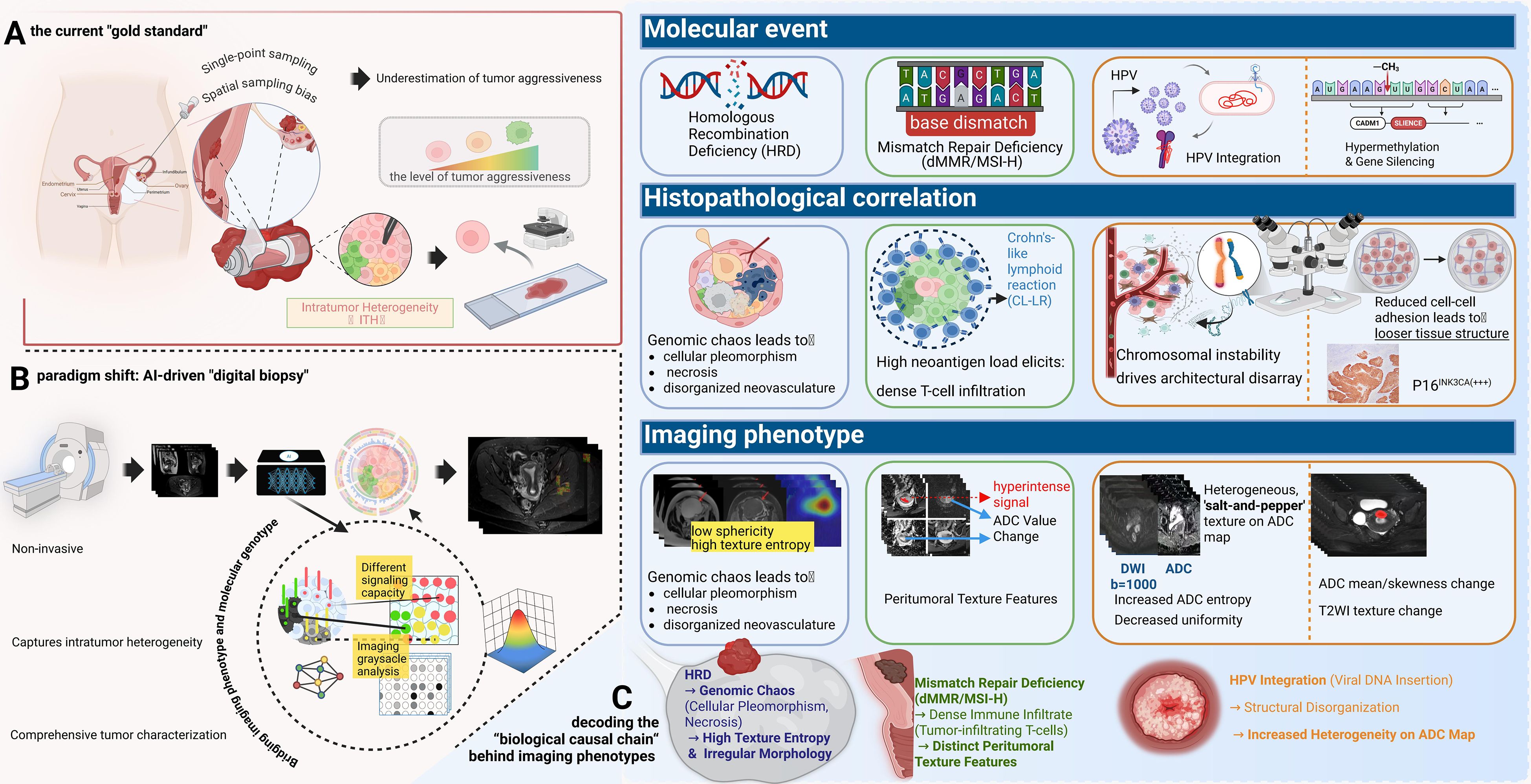 Figure 2. The paradigm shift to “digital biopsy” and the biological causal chain underlying imaging phenotypes. (A) Limitations of Physical Biopsy: The current “gold standard” relies on single-point sampling, which is prone to spatial bias and often underestimates tumor aggressiveness. (B) AI-Driven Digital Biopsy: A non-invasive approach that captures comprehensive intratumor heterogeneity across the entire tumor volume. (C) Decoding the Biological Causal Chain: This panel links molecular events to imaging signatures: HRD induces genomic chaos and necrosis, manifesting as high texture entropy and irregular morphology; dMMR/MSI-H triggers immune infiltration (e.g., Crohn’s-like lymphoid reaction), resulting in distinct peritumoral texture features; and HPV integration drives structural disorganization, reflected as a heterogeneous “salt-and-pepper” texture on ADC maps.