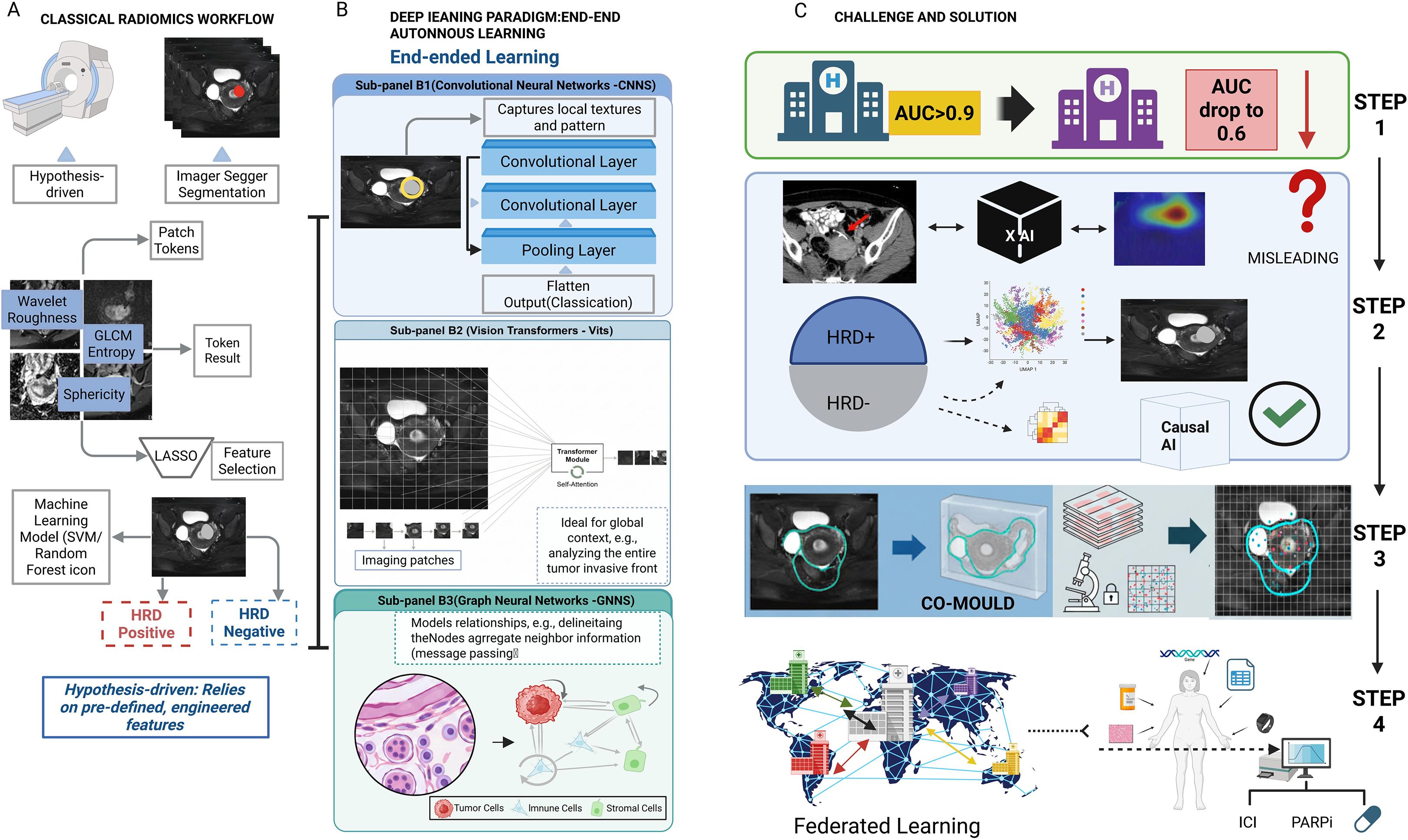 Figure 3. Comparison of classical radiomics versus deep learning paradigms and strategies for clinical translation. (A) Classical Radiomics Workflow: A hypothesis-driven pipeline involving tumor segmentation, extraction of handcrafted features (e.g., GLCM, wavelet), and feature selection (LASSO) to train machine learning classifiers. (B) Deep Learning Paradigm: An end-to-end autonomous learning approach comprising: (B1) CNNs for capturing local textures; (B2) Vision Transformers (ViTs) for encoding global context via self-attention; and (B3) Graph Neural Networks (GNNs) for modeling cellular topology and neighbor relationships. (C) Challenges and Solutions: The diagram outlines steps to bridge clinical gaps. Federated Learning addresses generalization issues (AUC drops). The CO-MOULD framework serves as a central engine for precise HRD stratification. Finally, Causal AI is integrated to filter misleading confounders, guiding targeted therapies like ICI and PARP inhibitors.