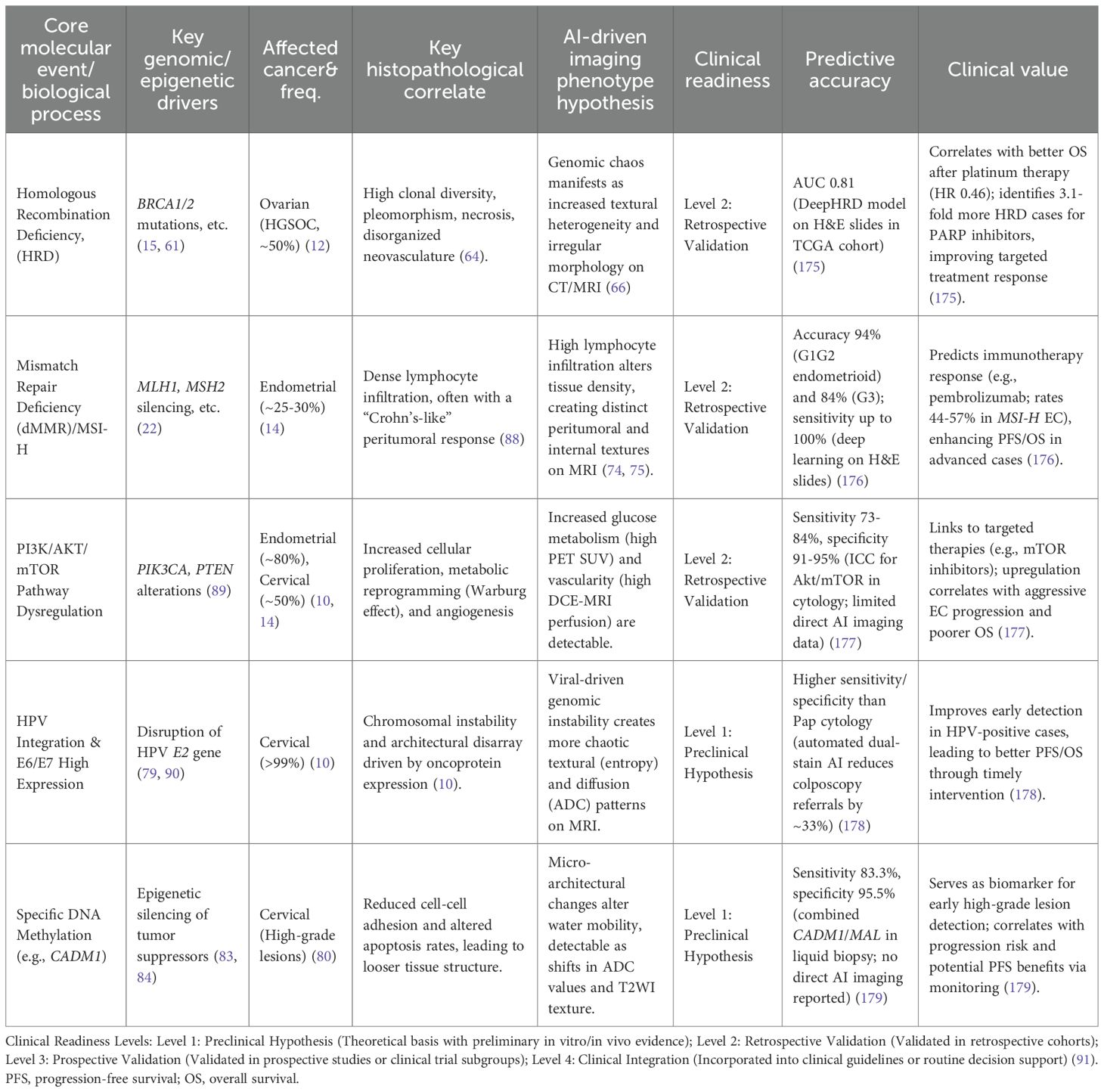 It is against this backdrop that the convergence of radiomics and artificial intelligence (AI) has emerged (25, 26). The core scientific hypothesis is that a tumor’s molecular genotype drives microscopic biological changes that manifest on macroscopic medical images as unique, quantifiable imaging phenotypes (25, 27, 28). This “digital biopsy” approach aims to decode the tumor’s biology directly from voxels, bridging the gap between genotype and phenotype. This concept forms the basis of the field of radiomics, which aims to bridge medical imaging and personalized medicine (26). We will explore how AI decodes key molecular markers, with a special focus on using cervical cancer to illustrate how AI can predict specific molecular events like HPV integration and DNA methylation, thereby showcasing the full potential of the digital biopsy paradigm (29, 30). The subsequent sections will delve into specific molecular markers, including the aforementioned HPV-driven events and DNA methylation patterns, to build a robust case for this transformative (31).