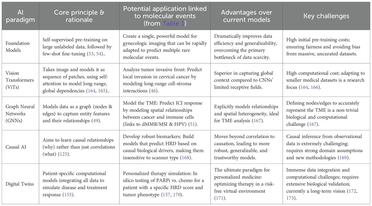 Artificial intelligence is no longer a distant concept but an increasingly imminent clinical reality in gynecologic oncology (147–149). We are on the cusp of a paradigm shift: medical imaging is evolving from a qualitative, anatomical tool into a powerful, quantitative probe capable of non-invasively decoding the core biology of a patient’s cancer (150). We have moved beyond simple prognosis to inferring specific, actionable molecular targets directly from pixels.