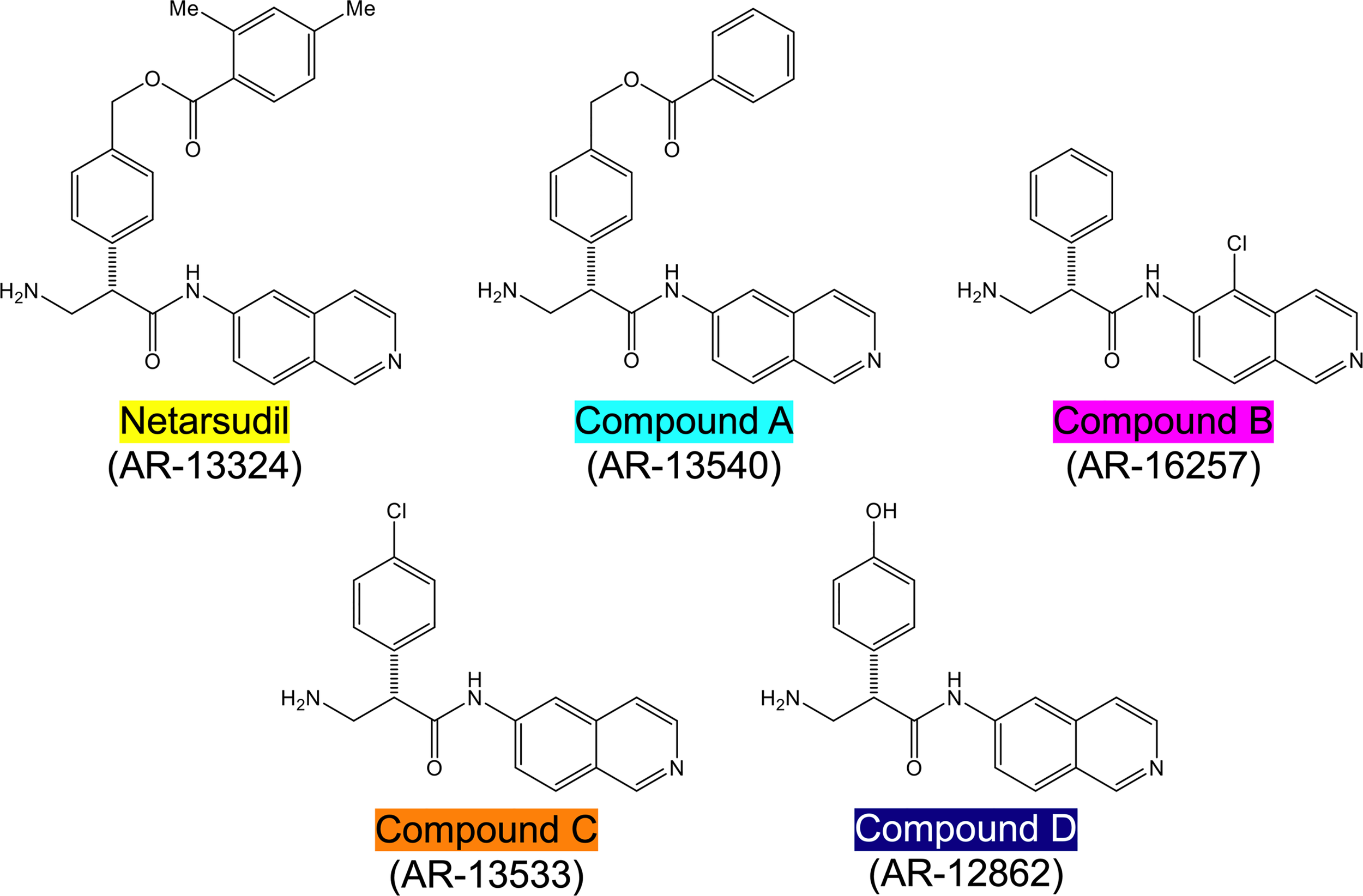 Structures of netarsudil-family ROCKi test compounds. Color code used throughout all figures.