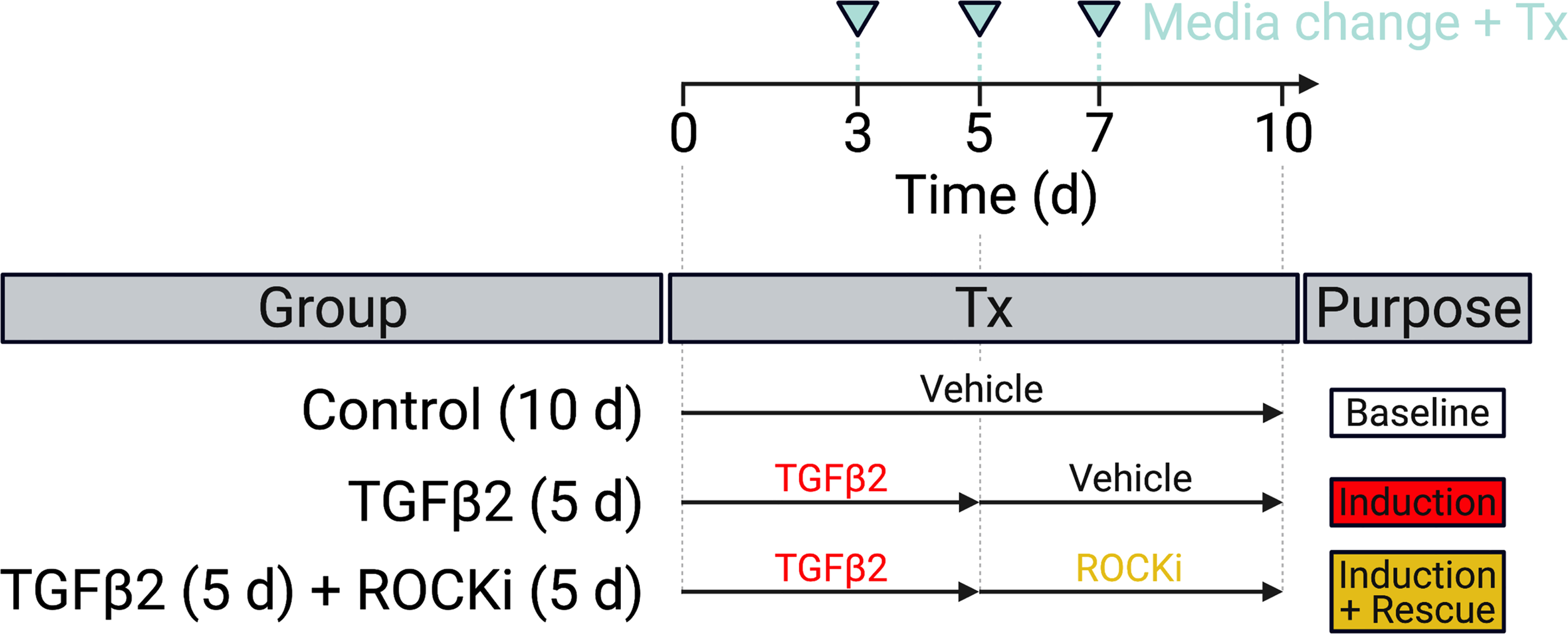 Experimental design. HTM hydrogels were treated with vehicle control (=baseline) or TGFβ2 for 5 d to induce a glaucoma-like cell phenotype (=induction) before adding netarsudil-family ROCKi test compounds for the next 5 d in absence of TGFβ2 (=induction + rescue), with fresh media supplied every 2-3 days.