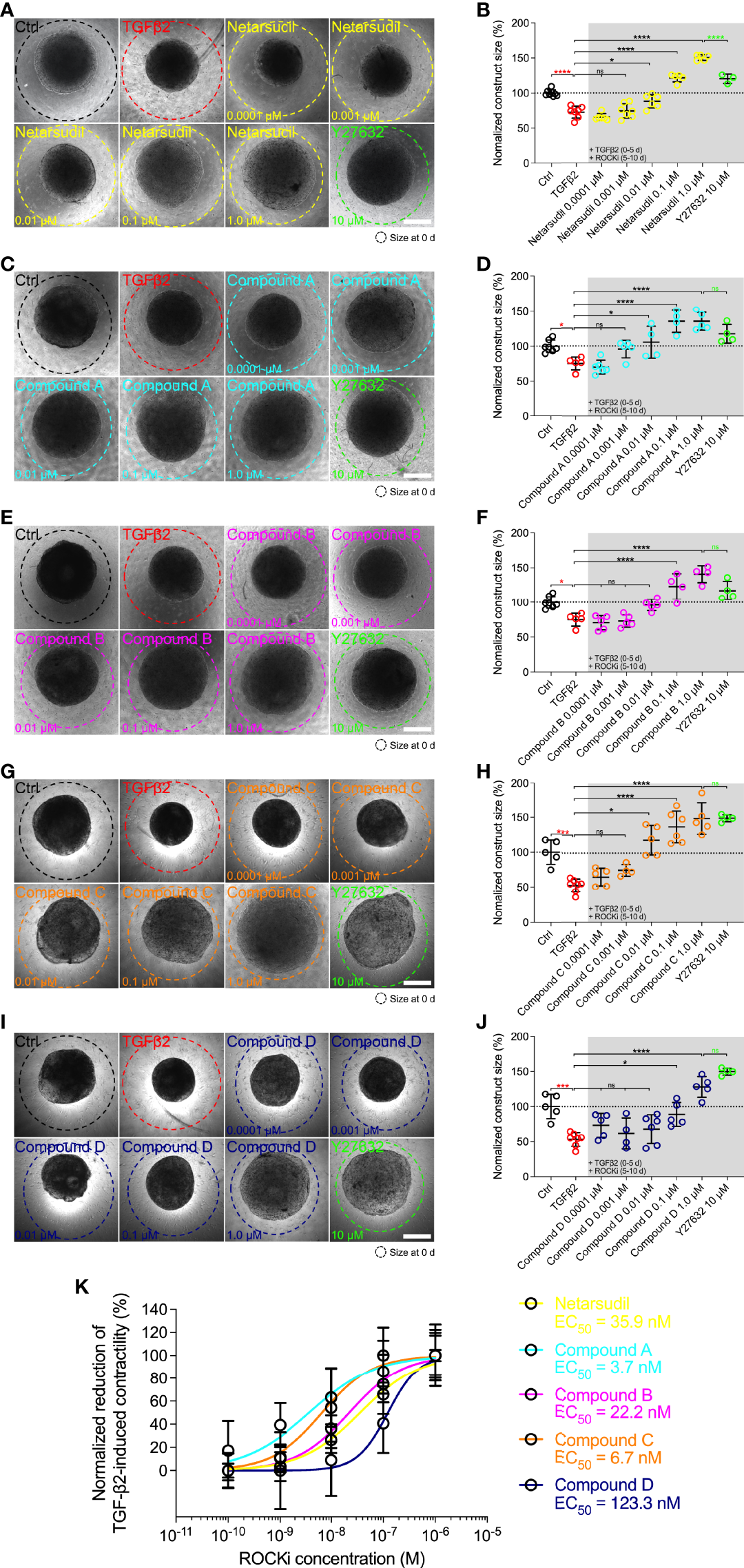 Dose response effects of netarsudil-family ROCKi treatment following TGFβ2-induction on HTM hydrogel contraction. Representative brightfield micrographs of HTM hydrogels encapsulated with HTM07 subjected to (A) netarsudil, (C) compound A, (E) compound B, (G) compound C, or (I) compound D over a broad dose range for 10 d, with Y27632 serving as refence control (dashed lines outline original construct size at 0 d). Scale bars, 1 mm. Construct size quantification of HTM hydrogels subjected to (B) netarsudil, (D) compound A, (F) compound B, (H) compound C, or (J) compound D (N = 3-8 replicates per group). (K) ROCKi dose response curves with calculated EC50 values. Data shown as Mean ± SD with individual data points. Significance was determined by one-way ANOVA using multiple comparisons tests (*p<0.05, ***p<0.001, ****p<0.0001; ns, not significant).