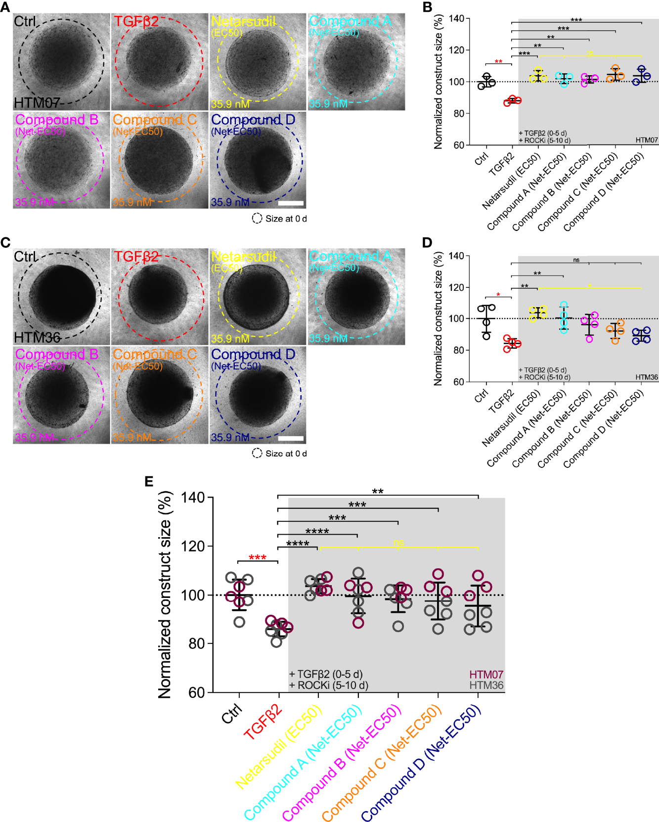 Effects of netarsudil-family ROCKi treatment at uniform netarsudil-EC50 following TGFβ2-induction on HTM hydrogel contraction. Representative brightfield micrographs of HTM hydrogels encapsulated with (A) HTM07 or (C) HTM36 subjected to the different treatments for 10 d (dashed lines outline original construct size at 0 d). Scale bars, 1 mm. Construct size quantification of HTM hydrogels encapsulated with (B) HTM07 or (D) HTM36 (N = 3-4 replicates per group). (E) Construct size quantification of HTM hydrogels encapsulated with HTM07 (maroon) or HTM36 (gray). Data shown as Mean ± SD with individual data points. Significance was determined by one- or two-way ANOVA using multiple comparisons tests (*p<0.05, **p<0.01, ***p<0.001, ****p<0.0001; ns, not significant).