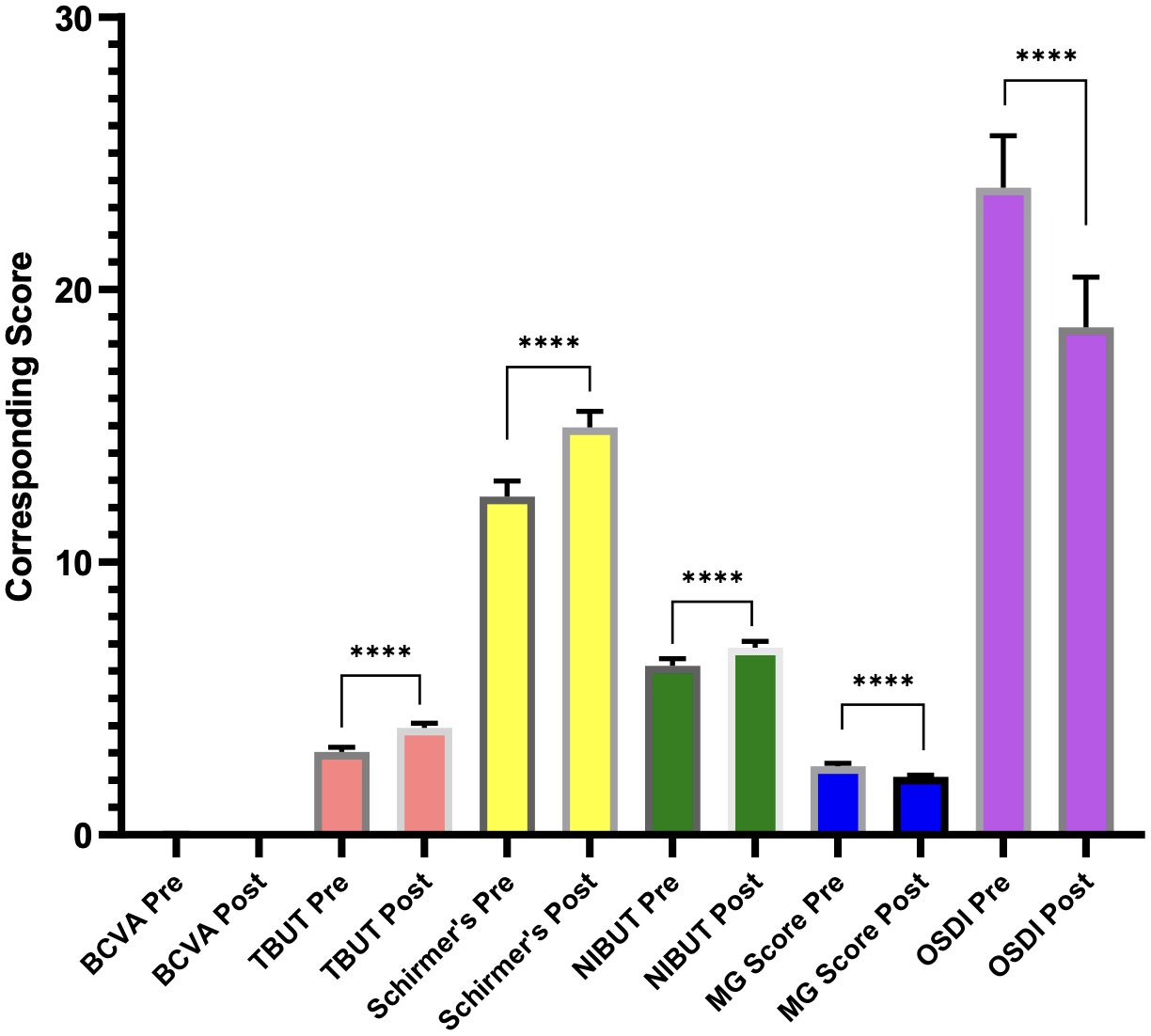 Figure 1. Graph showing improvement in dry eye disease parameters following the usage of Systane Complete eye drops. **** represents the difference between pre- and post-treatment values.